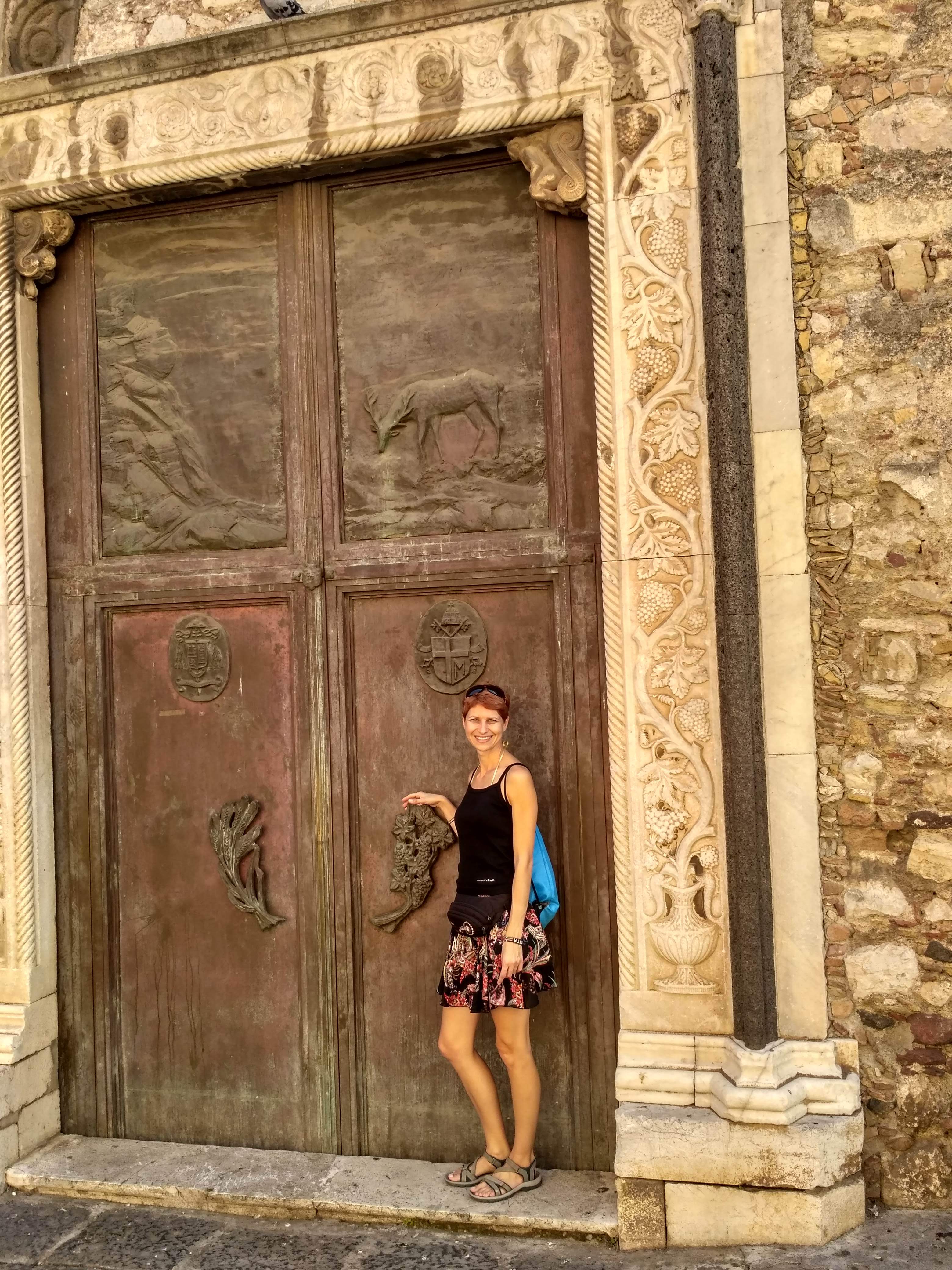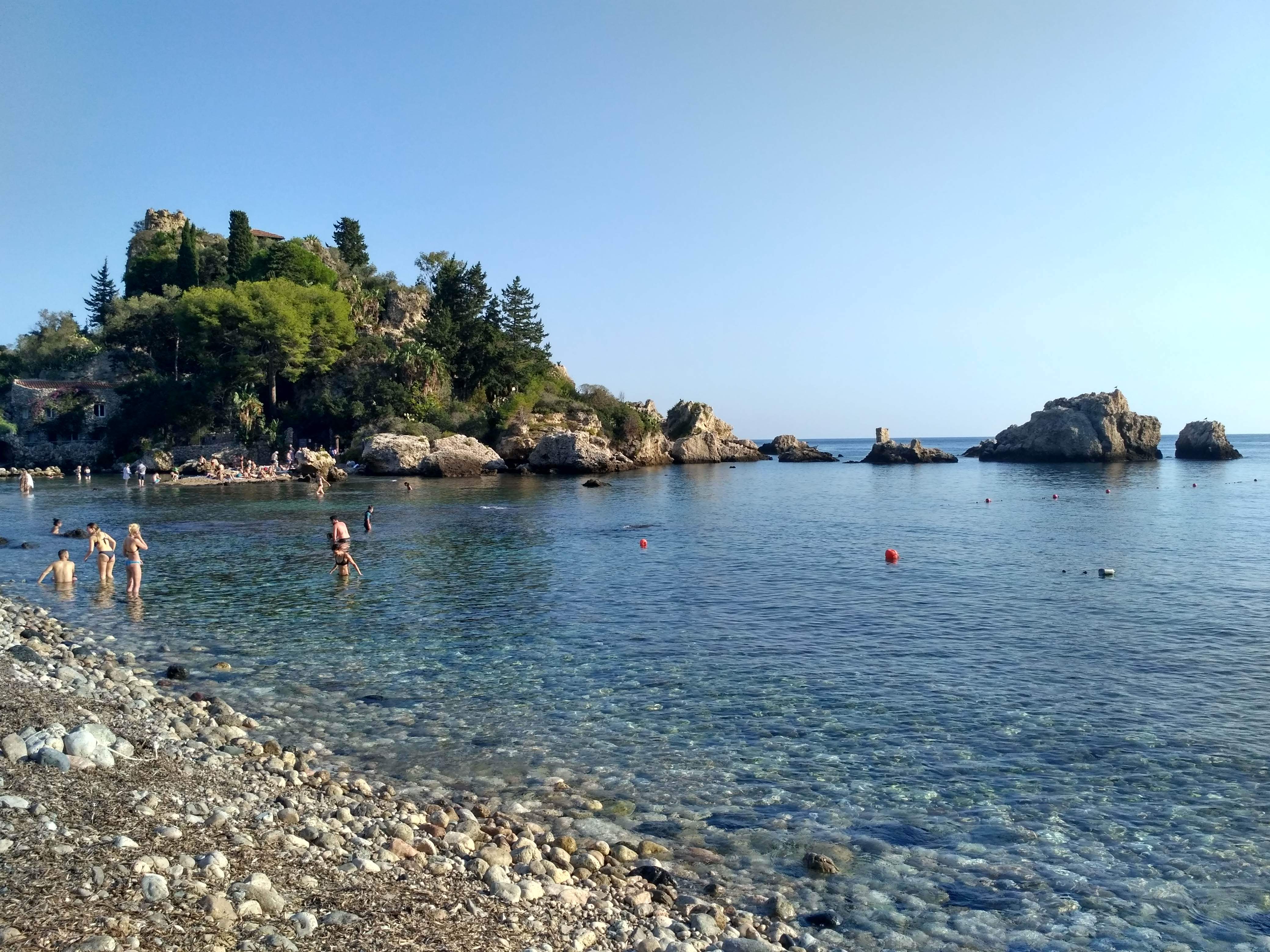Taormina okazała się uroczym miasteczkiem, położonym wysoko ponad zatoką. Czytałam, że jest bardzo snobistyczna, pełna drogich butików. Faktycznie były tam restauracje i sklepiki, w których zakupy mogłyby mocno nadwerężyć portfel, ale były też miejsca dostępne cenowo. Poszwędałyśmy się trochę, ponapawałyśmy widokami, wypiłyśmy pyszną kawę. Na koniec postanowiłyśmy jeszcze zejść na brzeg morza. W końcu byłyśmy na wyspie, było gorąco, a najmniej czasu spędziłyśmy nad wodą. Plaża była kamienista i całkiem mocno zatłoczona. Sporo było na niej turystów z Polski. Po plaży chodziły Chinki proponując za parę euro masaż pleców, stóp. Godząc się na masaż stóp, za chwilę przechodziły do masażu pleców, naklejały na koniec jakieś lecznicze plastry i ostatecznie cena okazywała się znacznie wyższa niż początkowe ustalenia. Niemniej jednak chwila na plaży była miłym zakończeniem wycieczki.