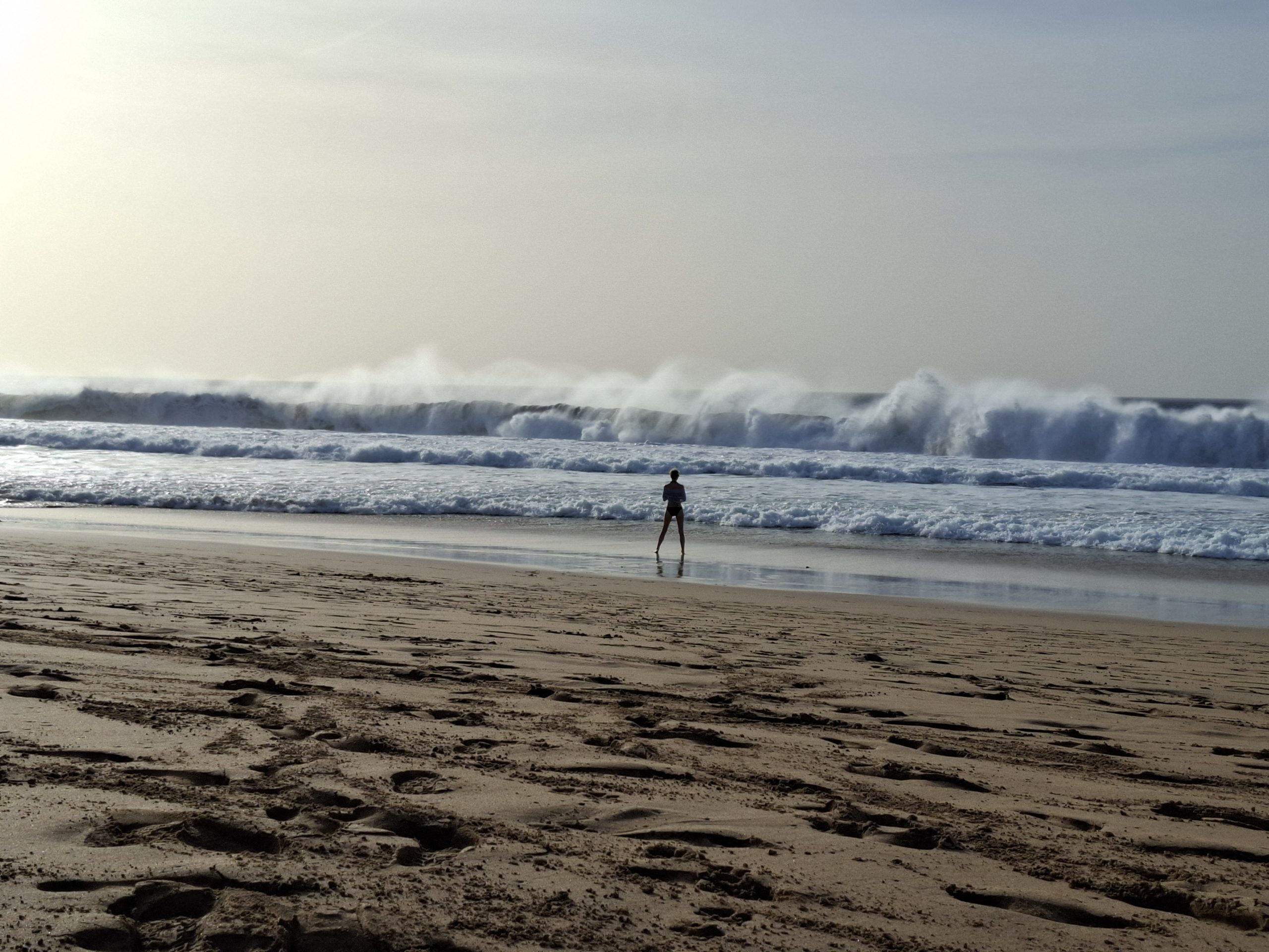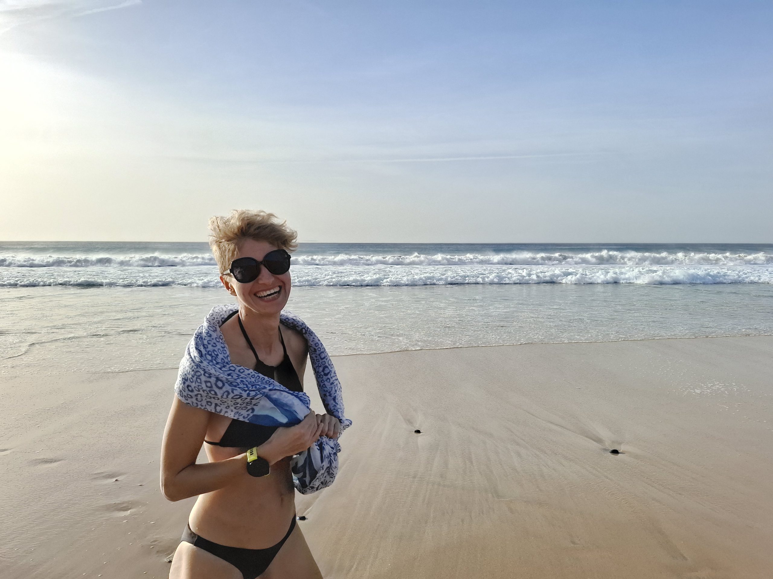 Szeroka i niemal pusta plaża, w oddali zakończona wysokimi klifami. Tak jak i wczoraj wieczorem niebo zrobiło się trochę zasnute i nie było czystego zachodu słońca. Ale dzięki temu i wiatrowi, nie jest tak upalnie.