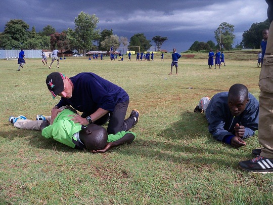 Gdy już kończyliśmy trening na stadion zleciały się dzieciaki. Miały lekcję w-fu. Biegały dookoła, przeskakiwały przez ustawione z boku przeszkody, grały w piłkę. Część przystanęła przy nas i przyglądała się temu co robimy. Yacool pokazał chłopakom skakankę, ale nie umieli skakać. Podobno Wilson świetnie skacze, sprawdzimy jak wróci z NY. Niektóre z dzieci chciały spróbować, jeden chłopiec, może ośmioletni naśladował yacoola chodzącego na rękach. Świetnie mu szło! Mathew skarżył się na ból w plecach. Jacek go trochę ponastawiał. Rueben podłapał pulsing, który mu ostatnio zrobiłam i zaczął pulsować leżącego na trawie kolegę.