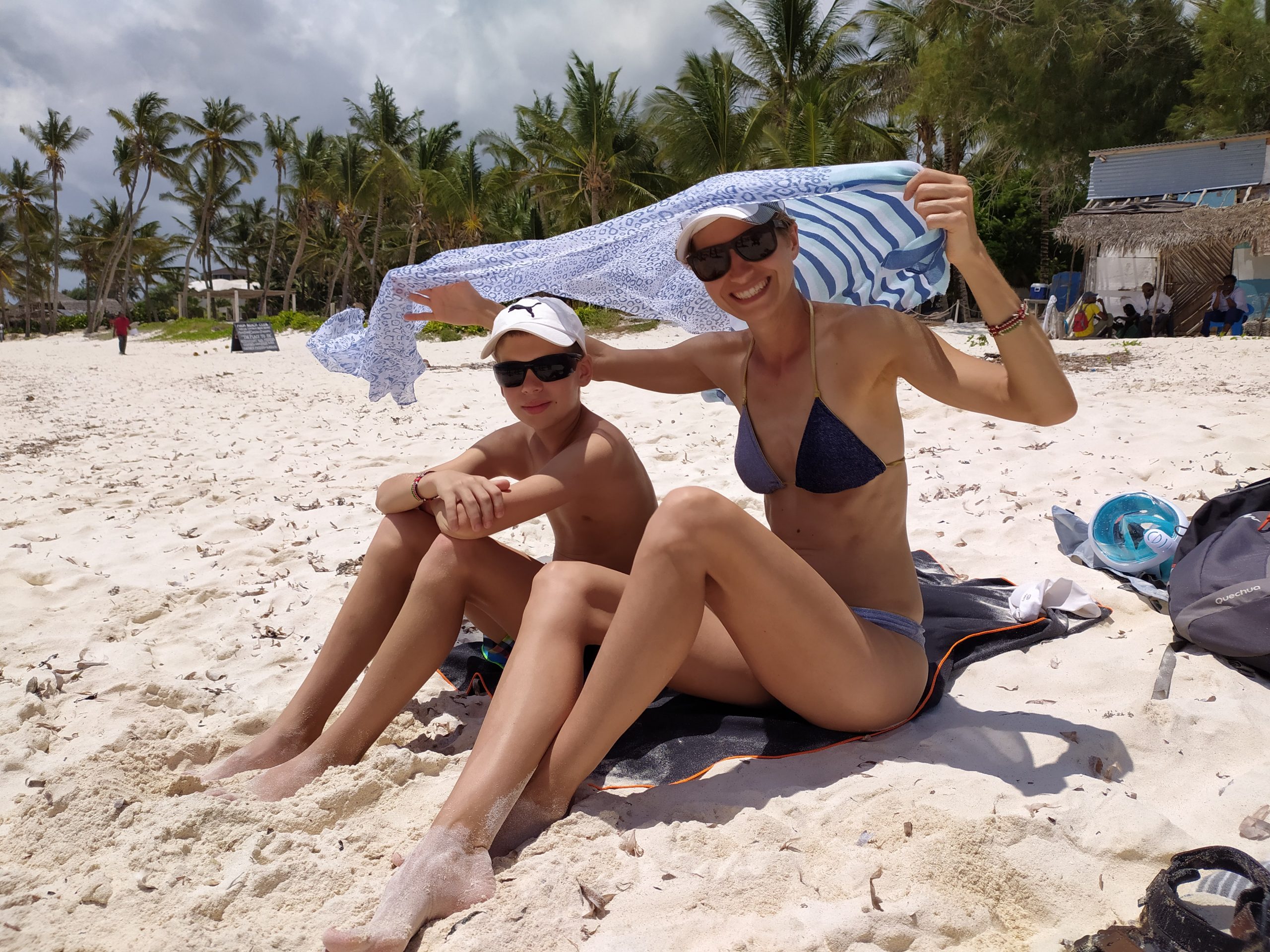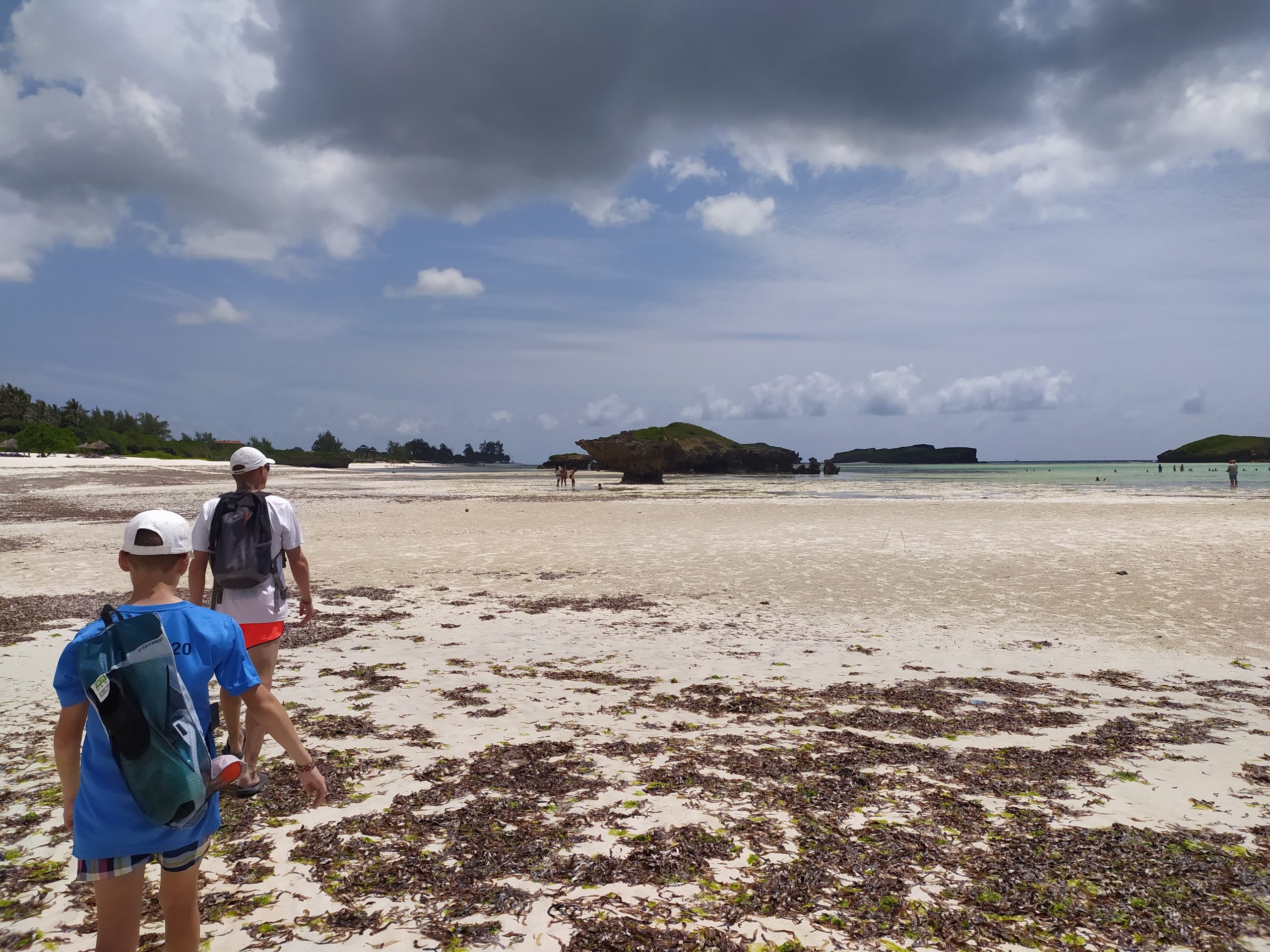Po śniadaniu poszliśmy na plażę. Był duży odpływ i można było niemal po piasku dojść do pobliskich koralowych wysepek. W wodzie sporo białych turystów. Jeden z lokalnych chłopaków, który tradycyjnie się do nas podczepił mówił, że przylatują tu wycieczki rainbowa. Szkoda, wolimy miejsca nieskażone masową turystyką. Zostawiliśmy chłopaków z rzeczami na plaży, a my z Jankiem poszliśmy popływać. Woda ma cudowne kolory, tylko na próżno szukać w niej schłodzenia, taka jest ciepła. Janek w końcu może nacieszyć się swoją maską. Faktycznie super się w niej pływa, można oglądać rybki, a piekielnie słona woda nie dostaje się do oczu.