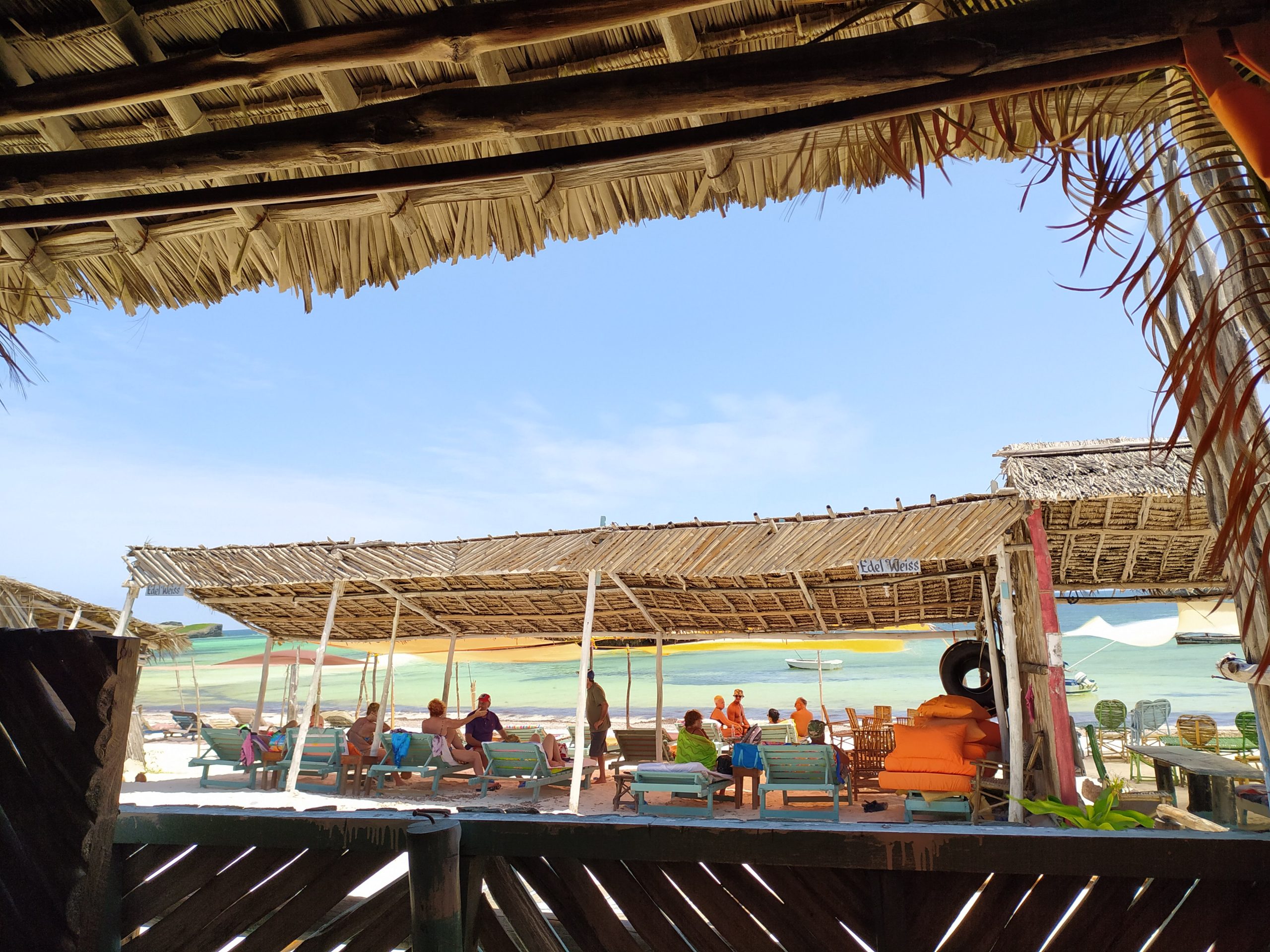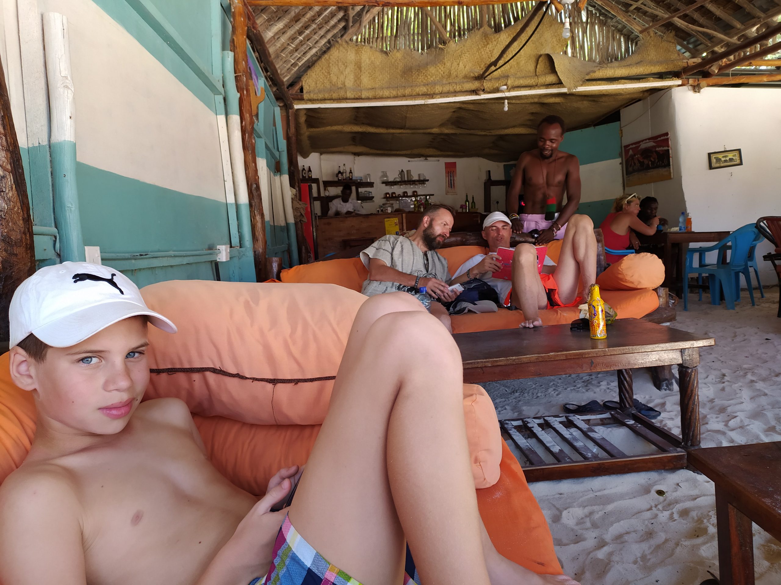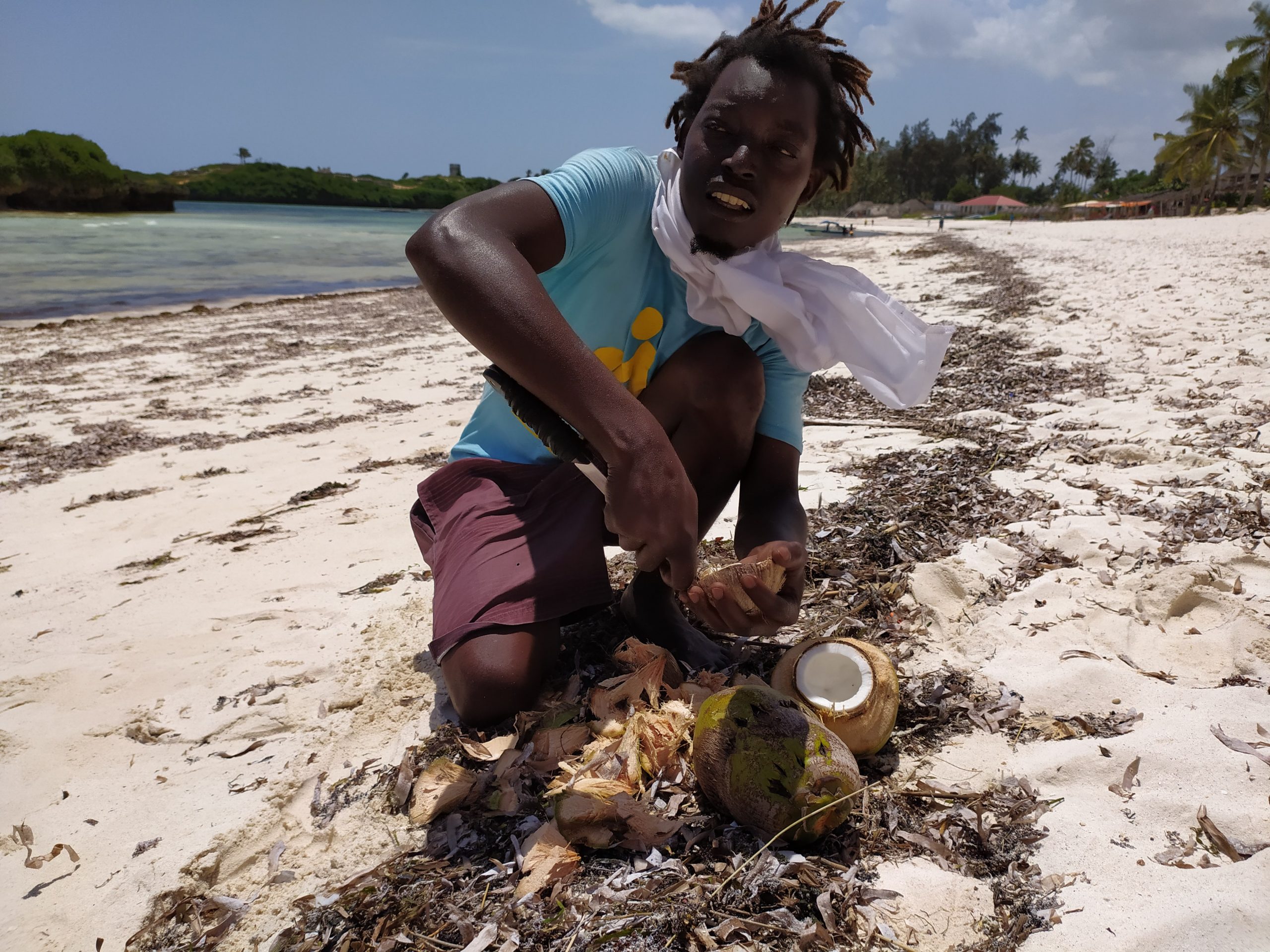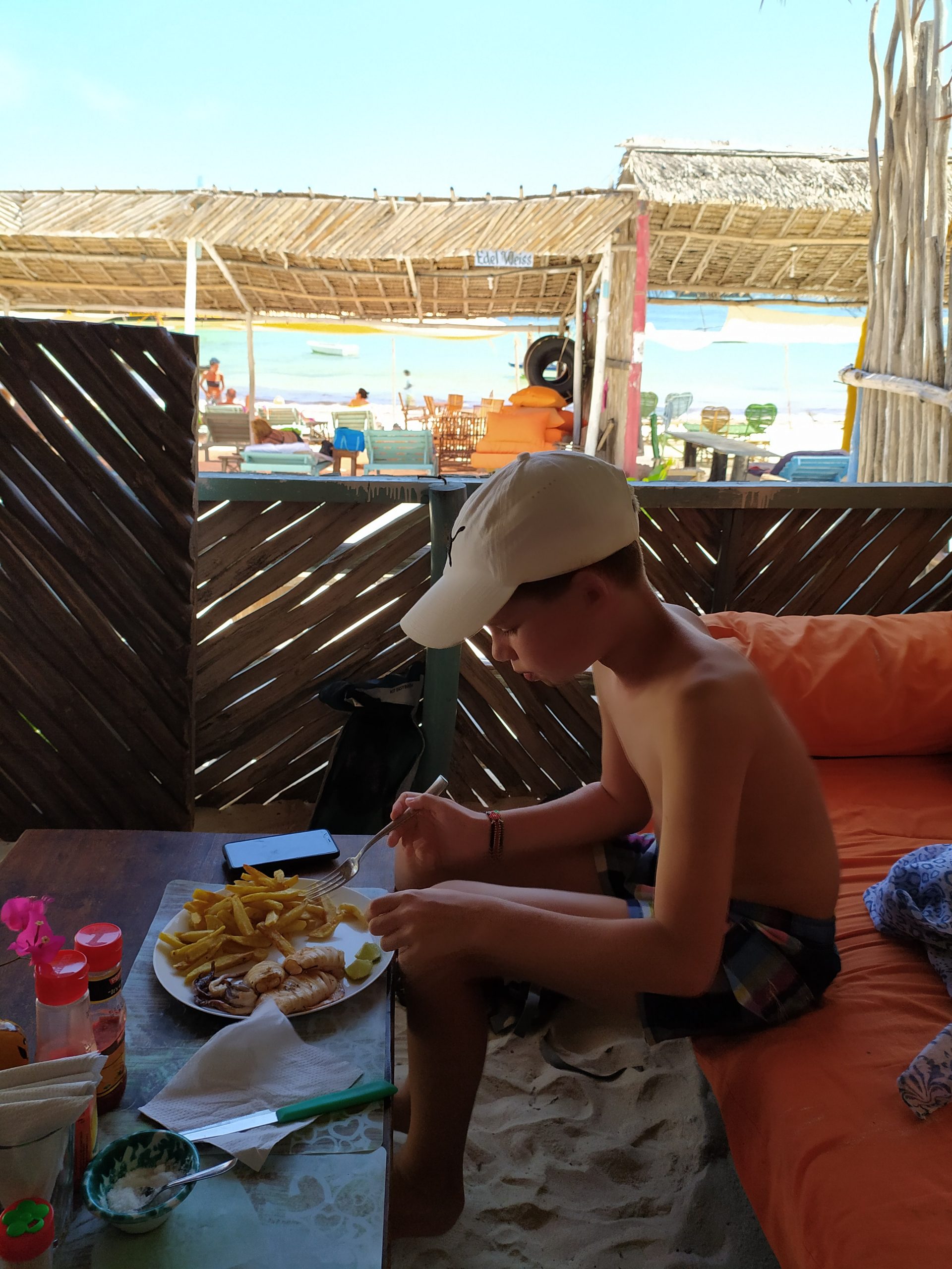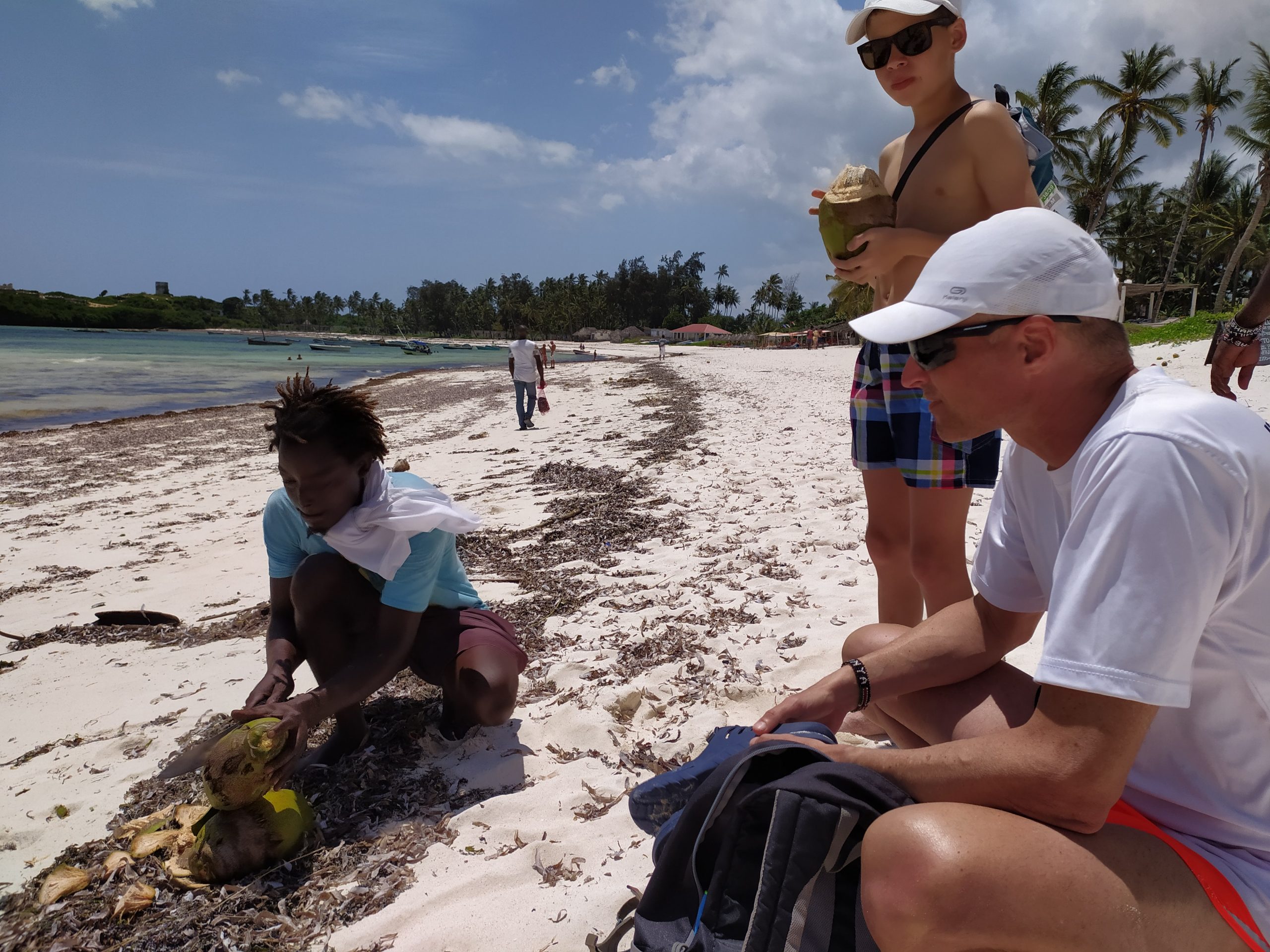 Gdy już schodziliśmy z plaży przybiegł chłopak z kokosami. Przy nas maczetą je obłupał. Napój wewnątrz był bardzo orzeźwiający. Po wypiciu rozciął kokos i oddzielił jego miąższ, pyszny i taki świeży. Kilka minut wcześniej zerwał kokosy prosto z palmy. Imbir zapraszał, byśmy choć na chwilę zajrzeli do knajpki na plaży, gdzie serwują lokalne dania. Miejsce okazało się bardzo sympatyczne, w tle leciało kenijskie reagge, a dania tańsze niż we wczorajszej restauracji. Zamówiliśmy sobie ryż gotowany na mleku kokosowym i rybkę. Janek frytki z kalmarami z grilla. Po około pół godzinie dostaliśmy nasze potrawy. Jedzenie było bardzo smaczne.