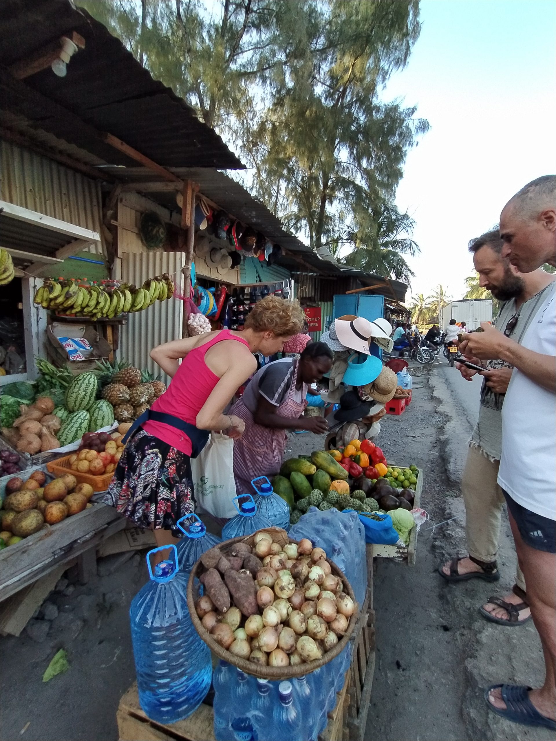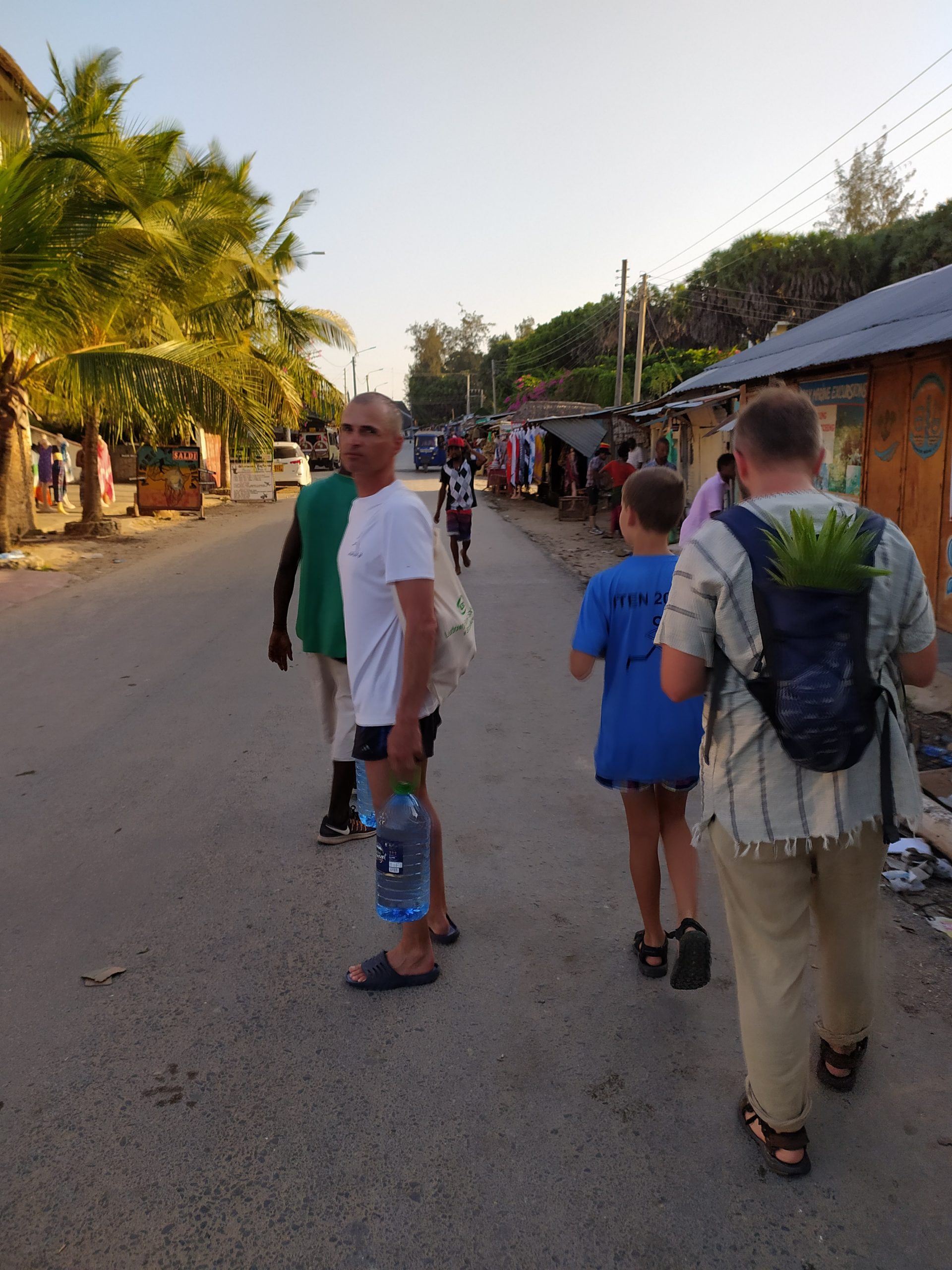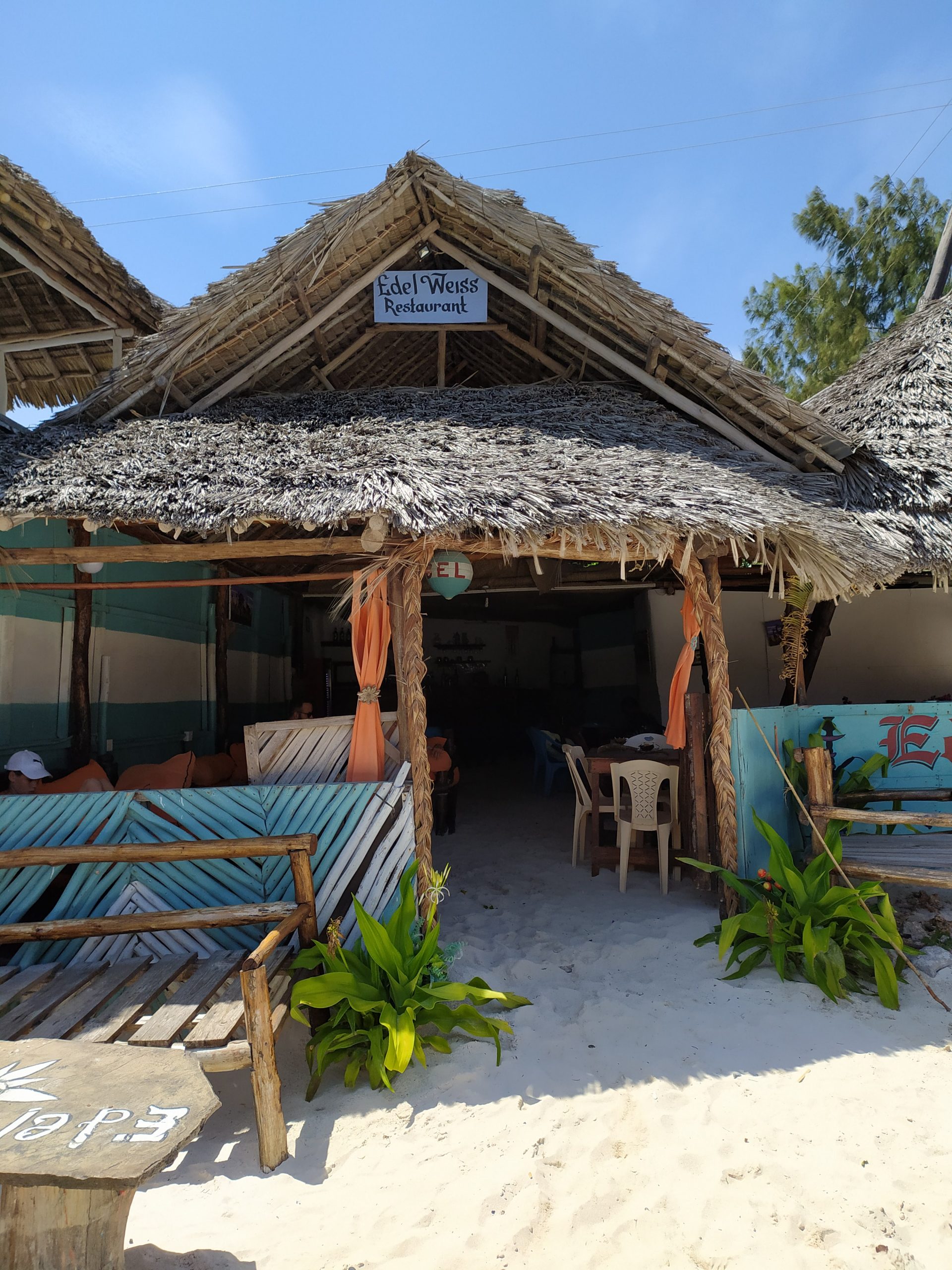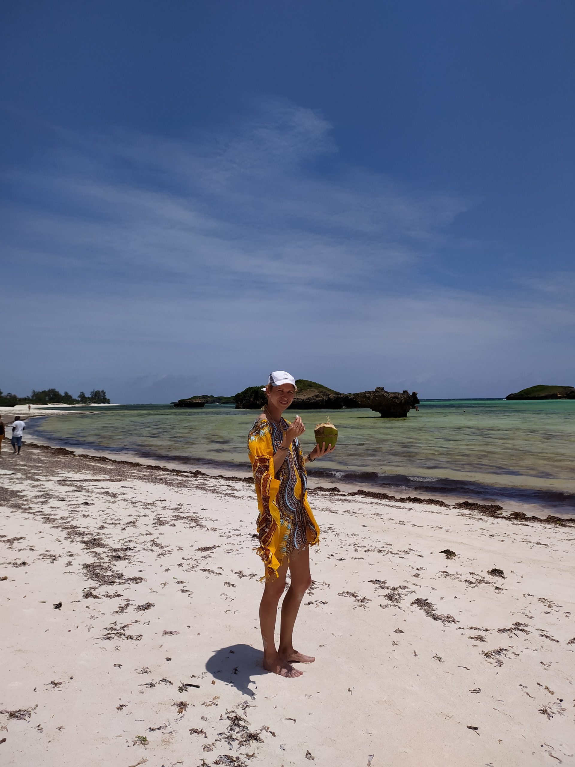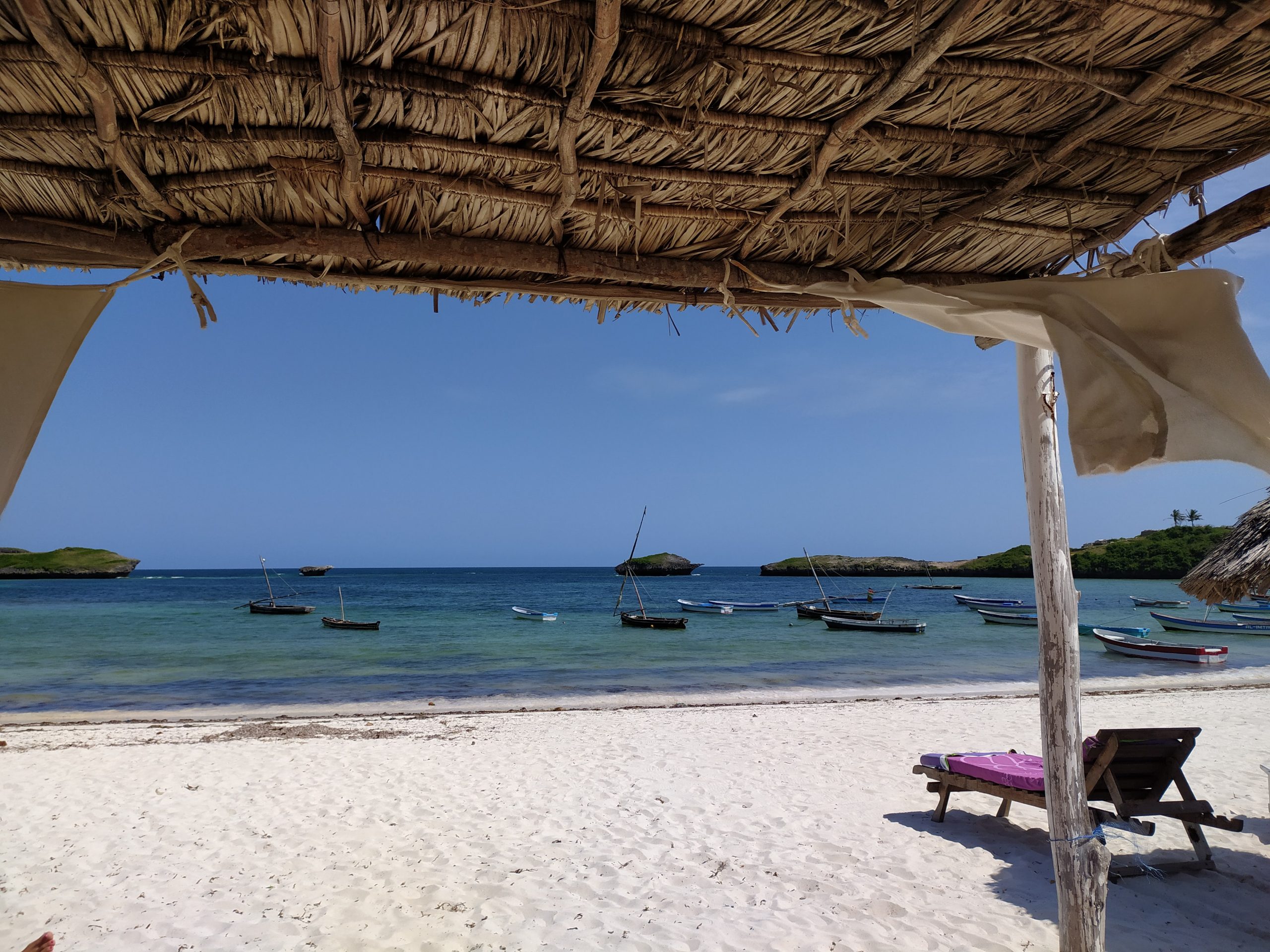 Gdy już schodziliśmy z plaży przybiegł chłopak z kokosami. Przy nas maczetą je obłupał. Napój wewnątrz był bardzo orzeźwiający. Po wypiciu rozciął kokos i oddzielił jego miąższ, pyszny i taki świeży. Kilka minut wcześniej zerwał kokosy prosto z palmy. Imbir zapraszał, byśmy choć na chwilę zajrzeli do knajpki na plaży, gdzie serwują lokalne dania. Miejsce okazało się bardzo sympatyczne, w tle leciało kenijskie reagge, a dania tańsze niż we wczorajszej restauracji. Zamówiliśmy sobie ryż gotowany na mleku kokosowym i rybkę. Janek frytki z kalmarami z grilla. Po około pół godzinie dostaliśmy nasze potrawy. Jedzenie było bardzo smaczne.