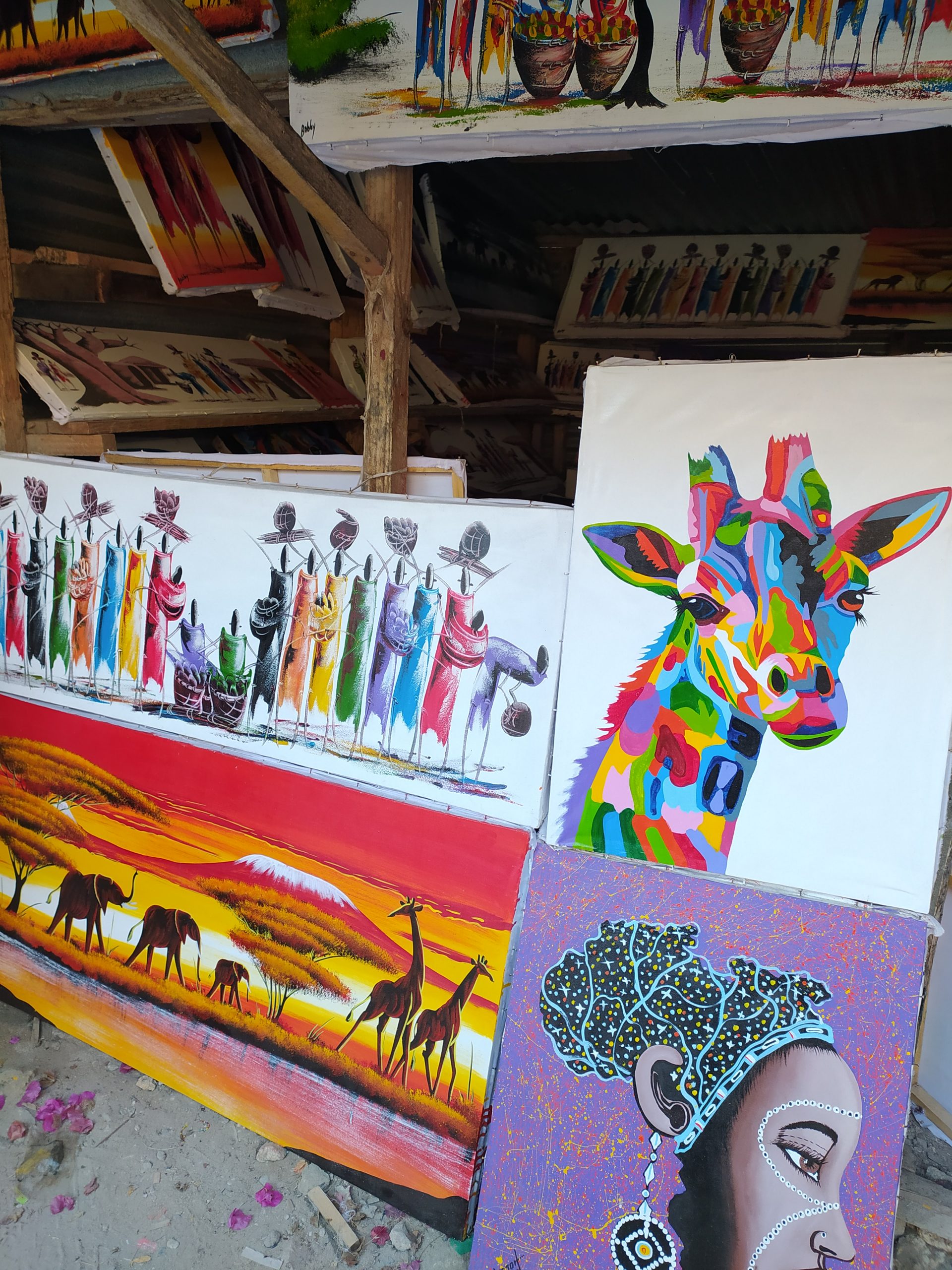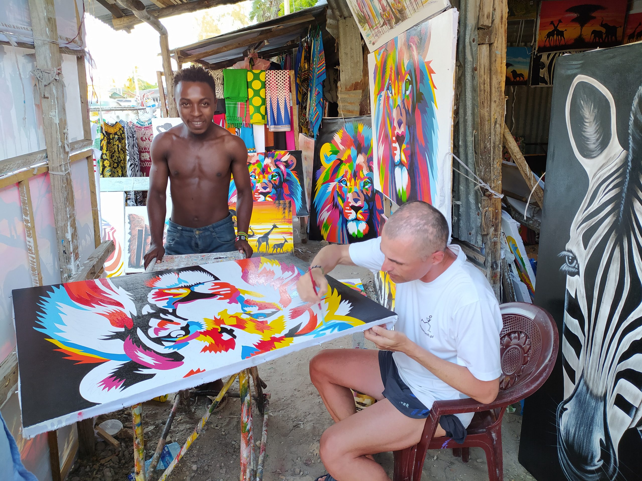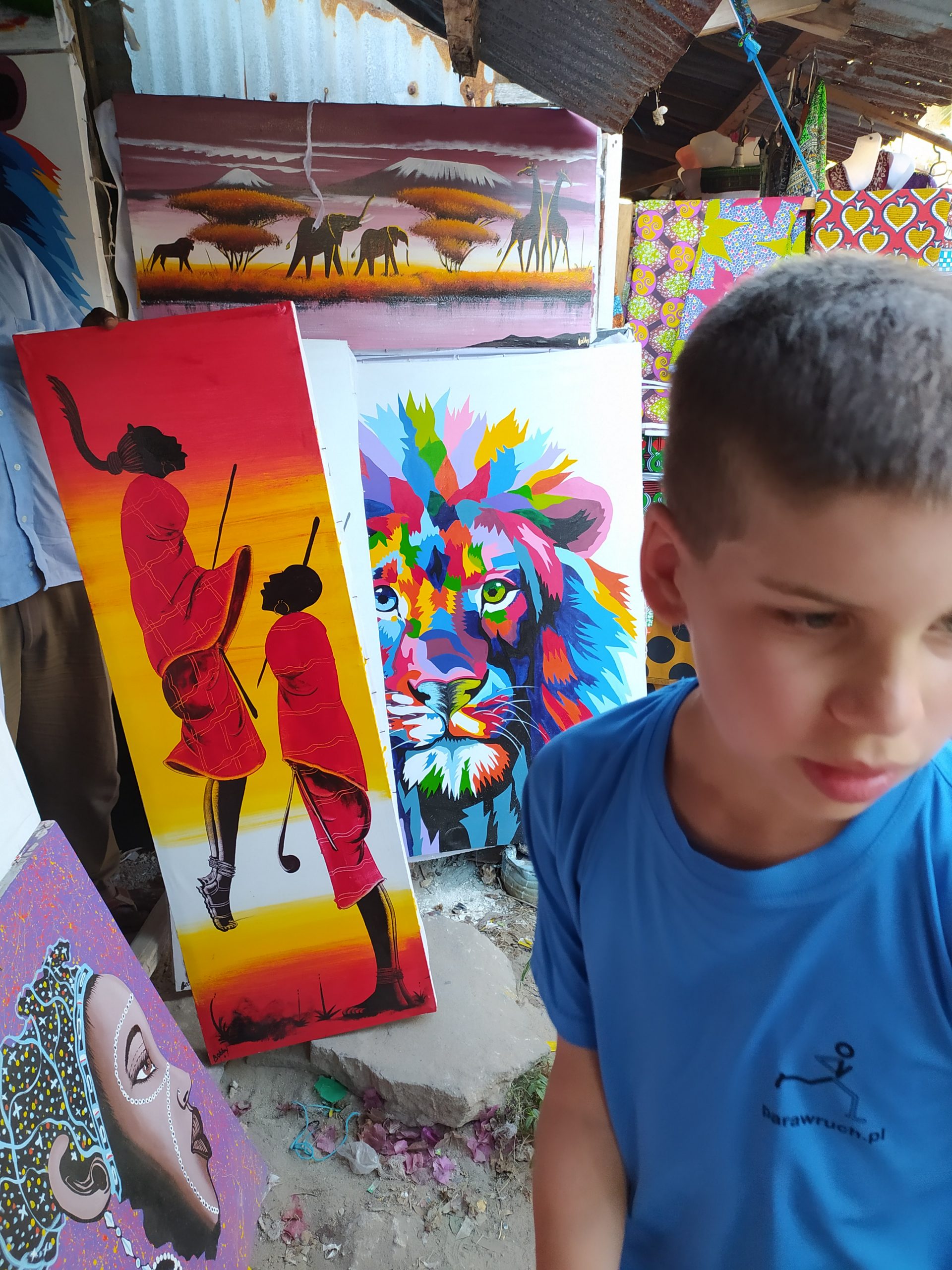 Spacerkiem wróciliśmy do naszego domku i zalegliśmy w recepcji chłodząc się wiatrakami. Po południu wyszliśmy na zakupy. Kupiliśmy całe siatki owoców i warzyw. Yacoolowi bardzo zasmakował owoc o nazwie tomoko. W sumie jadalny w nim jest tylko słodki miąższ. Nie ma go dużo, otacza on czarne spore pestki wewnątrz owocu. Może jutro nakręcę filmik i go pokażę. Sprzedawcy straganów prosili nas o zaglądanie na nich stoiska, wołając „watching is for free”. Przymierzyłam kilka sukienek z żyrafami, zastanawiam się nad kupnem. Janek zamówił sobie obraz skaczących Masajów. Spodobał mu się jeden ze wzorów, ale zamiast białego tła wolał tło w kolorze kenijskiej ziemi. Pani powiedziała, że nie ma żadnego problemu i w niedzielę mamy odebrać płótno. Wracając zaszliśmy jeszcze do włoskiej kawiarni na lody. Kawy już nam nie podali, bo lokal mimo obłożenia gośćmi zamykają o 18. Dziwne. Choć może taki mają tu rytm, bo o tej godzinie otwierają się już inne knajpy, serwujące grillowane owoce morza, mięsa i samosy. Na dworze robi się przyjemniej, chłodniej. Ulica ożywa, dużo na niej miejscowych i turystów, trąbiących tuk-tuków i motorków. Trochę jak w Mielnie. Tylko, że o 19 jest już zupełnie ciemno.