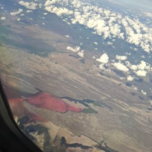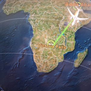 Po kilkunastu godzinach podróży wylądowaliśmy w Zimbabwe. Loty Etiopczykiem były całkiem przyjemne. Samolot na obu lotach w dużej mierze pusty. Na locie z Addis Abeby do Victoria Falls swobodnie biegałam między rzędami oglądając świat z góry. Było Kilimandżaro i jezioro Natron w kolorze różo-czerwieni. Pustynne krajobrazy i wielka rzeka Zambezi.