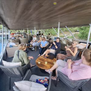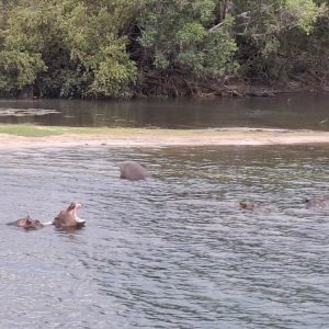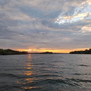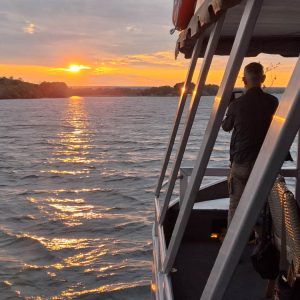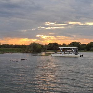 Po przylocie krótki relaks w hotelowym basenie i po południu pojechaliśmy do pobliskiej przystani skąd ruszyliśmy w rejs po Zambezi. To był piękny rejs rzeką, która tworzy naturalną granicę między Zimbabwe i Zambią. W wodzie widzieliśmy kilka grup hipopotamów, na brzegu wylegiwały się krokodyle. Kucharz zaserwował nam trzydaniową kolację przy zachodzie słońca. Pełen szacunek jak to w tej małej kuchni na statku ogarnął! Było pysznie i ładnie podane.