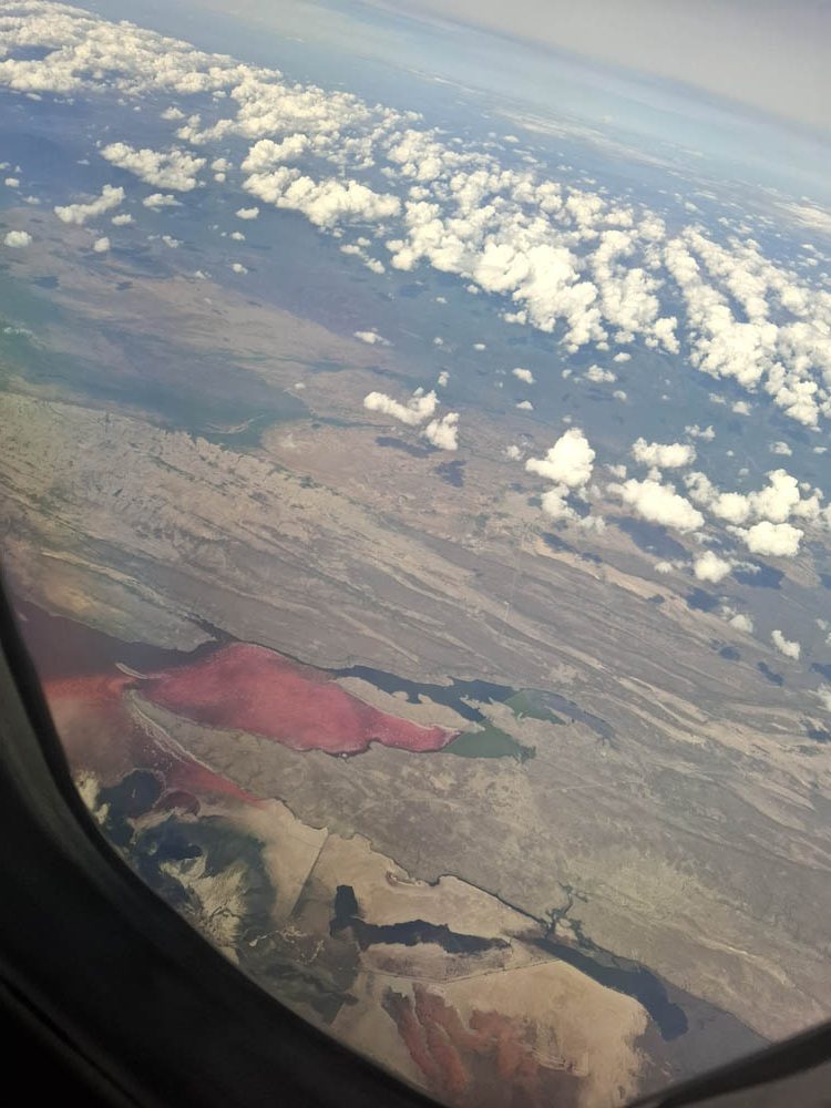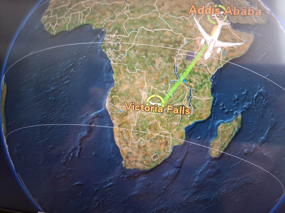 Po kilkunastu godzinach podróży wylądowaliśmy w Zimbabwe. Loty Etiopczykiem były całkiem przyjemne. Samolot na obu lotach w dużej mierze pusty. Na locie z Addis Abeby do Victoria Falls swobodnie biegałam między rzędami oglądając świat z góry. Było Kilimandżaro i jezioro Natron w kolorze różo-czerwieni. Pustynne krajobrazy i wielka rzeka Zambezi.