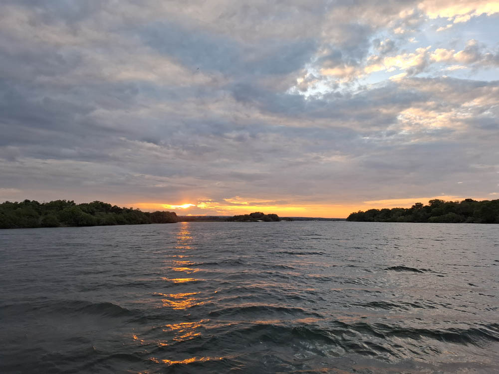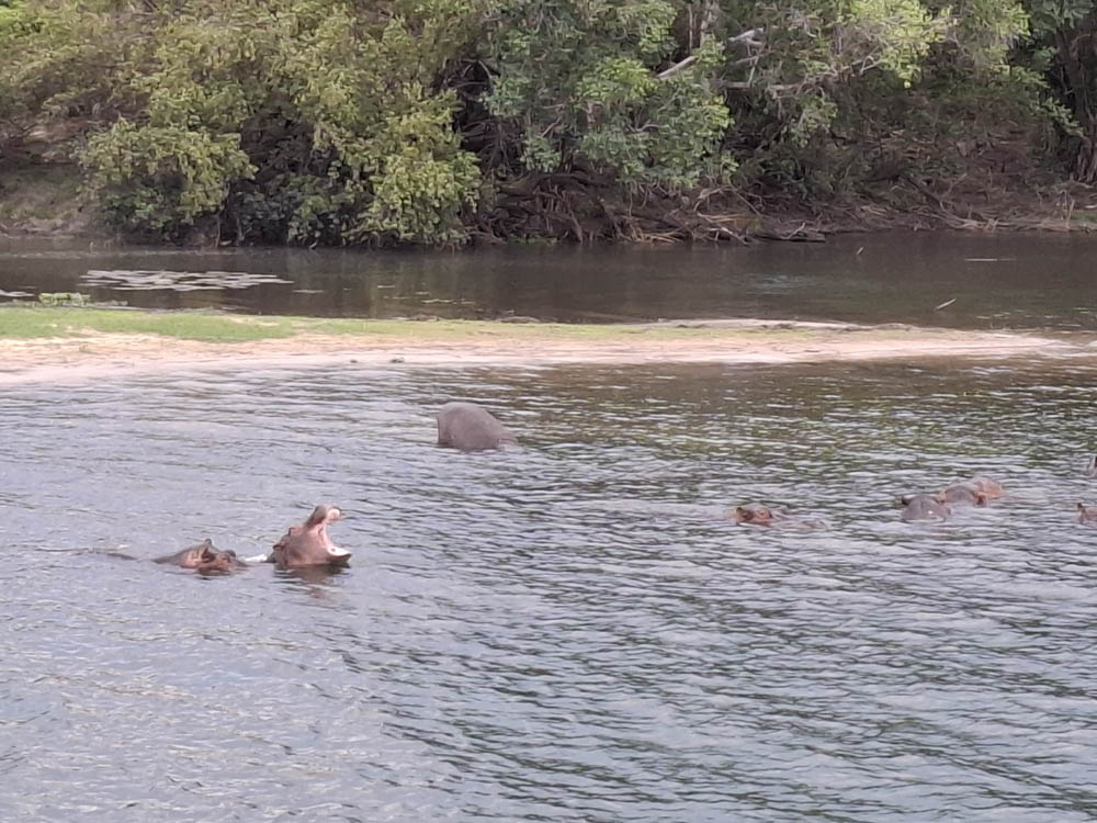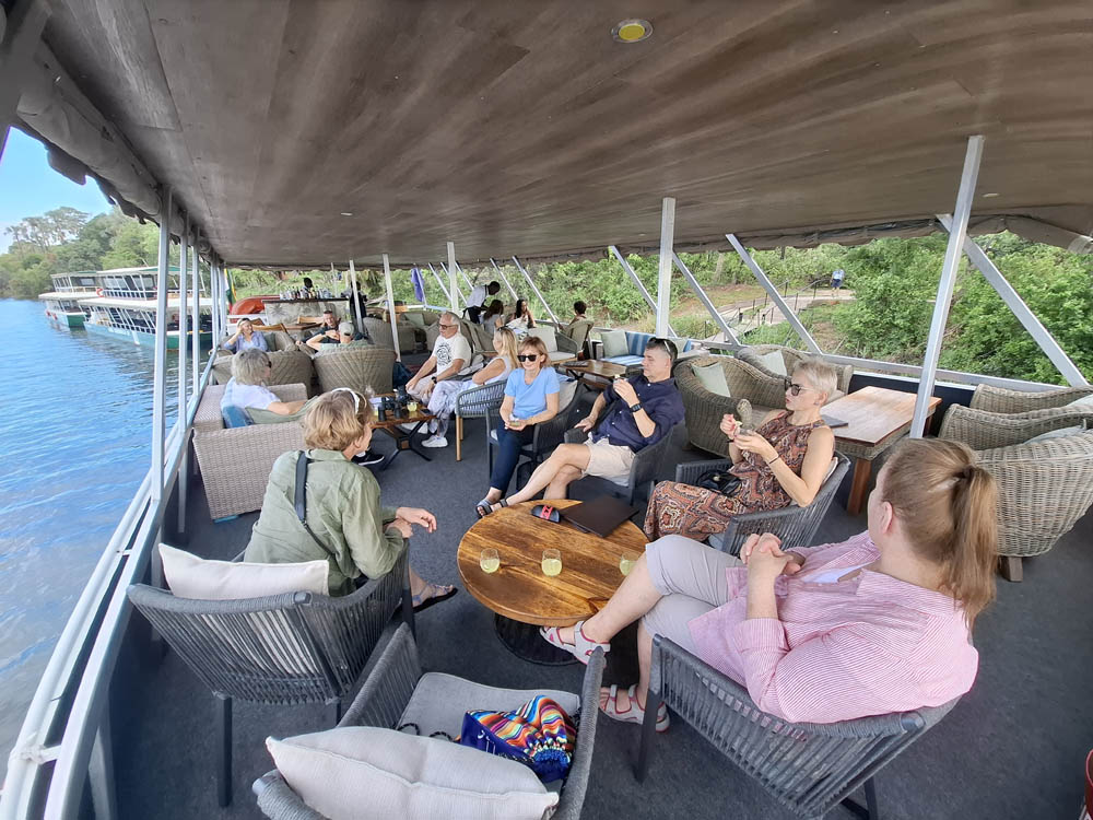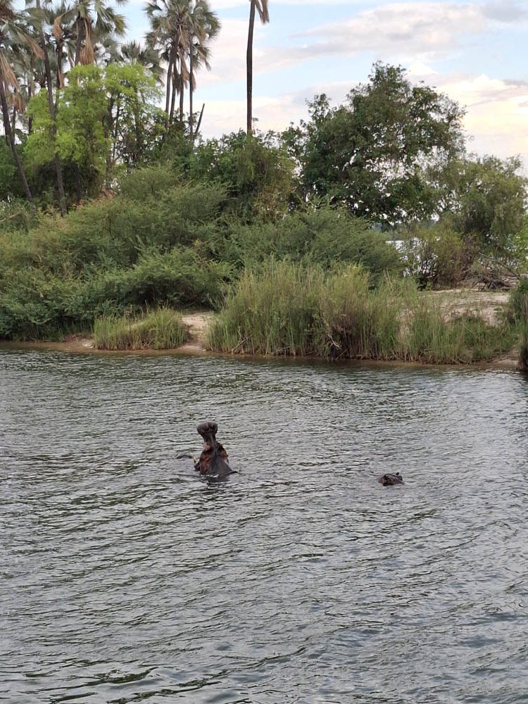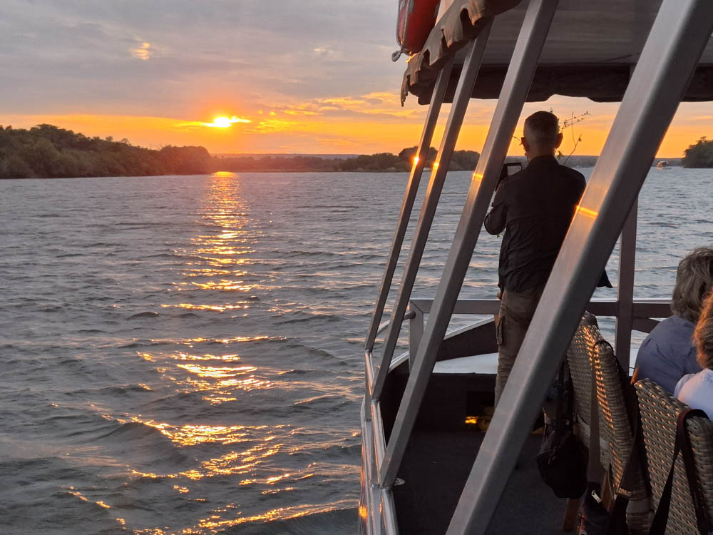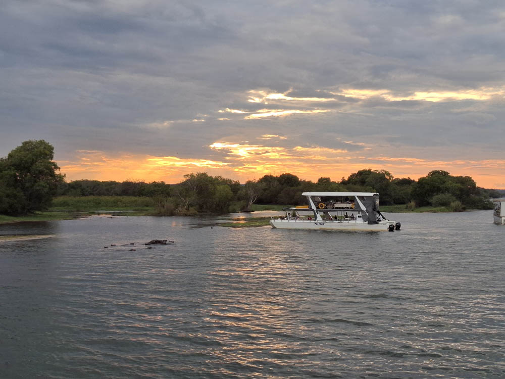 Po przylocie krótki relaks w hotelowym basenie i po południu pojechaliśmy do pobliskiej przystani skąd ruszyliśmy w rejs po Zambezi. To był piękny rejs rzeką, która tworzy naturalną granicę między Zimbabwe i Zambią. W wodzie widzieliśmy kilka grup hipopotamów, na brzegu wylegiwały się krokodyle. Kucharz zaserwował nam trzydaniową kolację przy zachodzie słońca. Pełen szacunek jak to w tej małej kuchni na statku ogarnął! Było pysznie i ładnie podane.