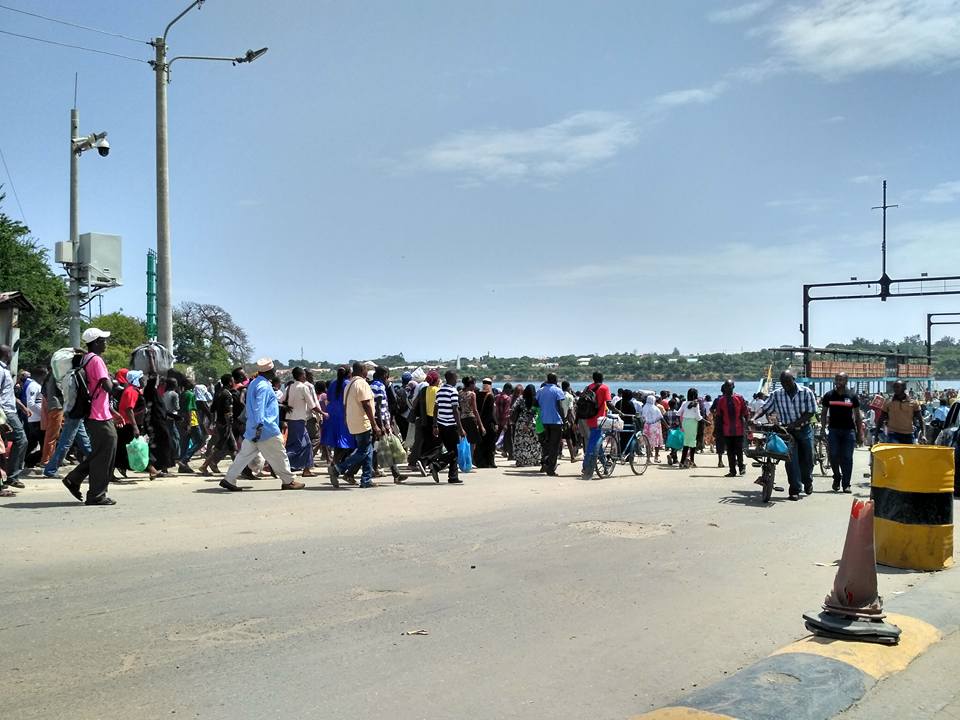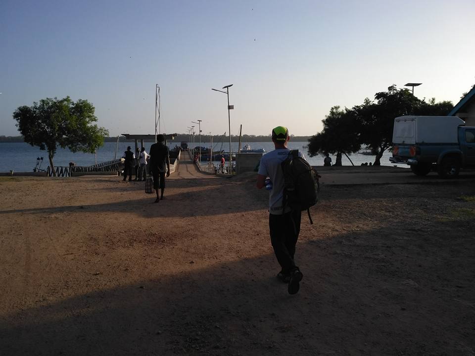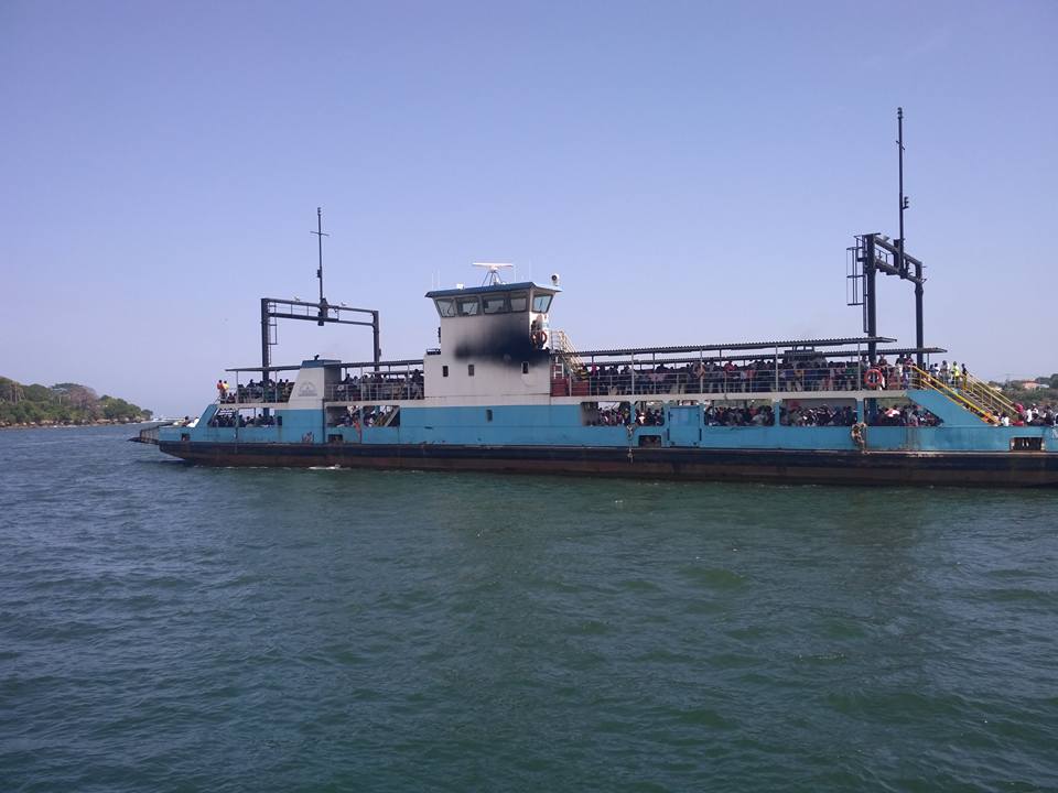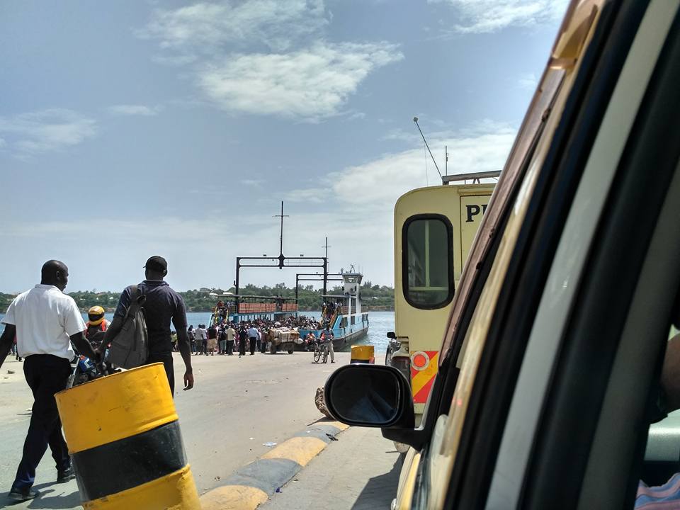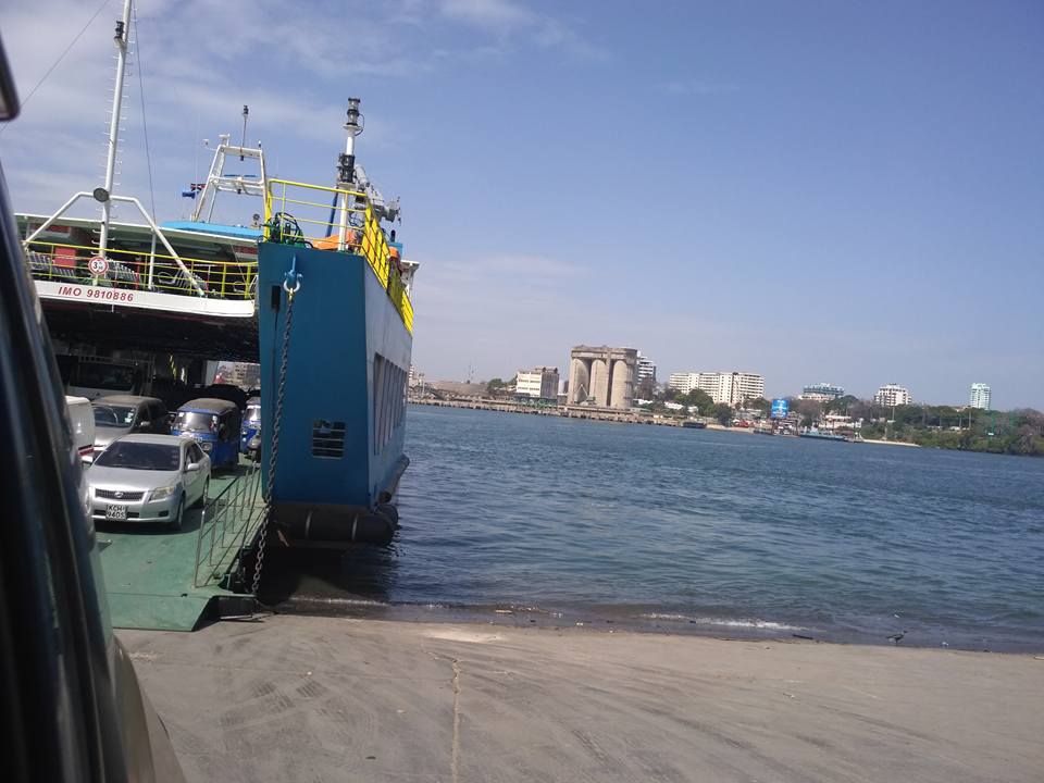 Johnton zawiózł nas do centrum, gdzie nie wychodząc z auta wymieniliśmy dolary. Zrobiliśmy też sobie pamiątkową fotkę pod symbolicznymi kłami. Dalej przejechaliśmy na prom, który miał nas przewieźć z wyspy na stały ląd, do Likoni. Między dwoma brzegami kursują w sumie trzy promy. Dla pieszych są one bezpłatne, auta osobowe płacą dolara za przejazd w jedną stronę. Staliśmy z dobre pół godziny w kolejce, zanim wjechaliśmy na prom. W między czasie patrzyliśmy jak dobijał i odpływał prom przewożący jedynie ludzi. Na jego pokład weszło około tysiąc osób. W końcu i my wjechaliśmy na prom. Przeprawa trwała niecałe 10 minut. Oficjalnie jest zakaz filmowania i robienia zdjęć. Yacool z ukrycia trochę ponagrywał, ja pstryknęłem parę fotek.