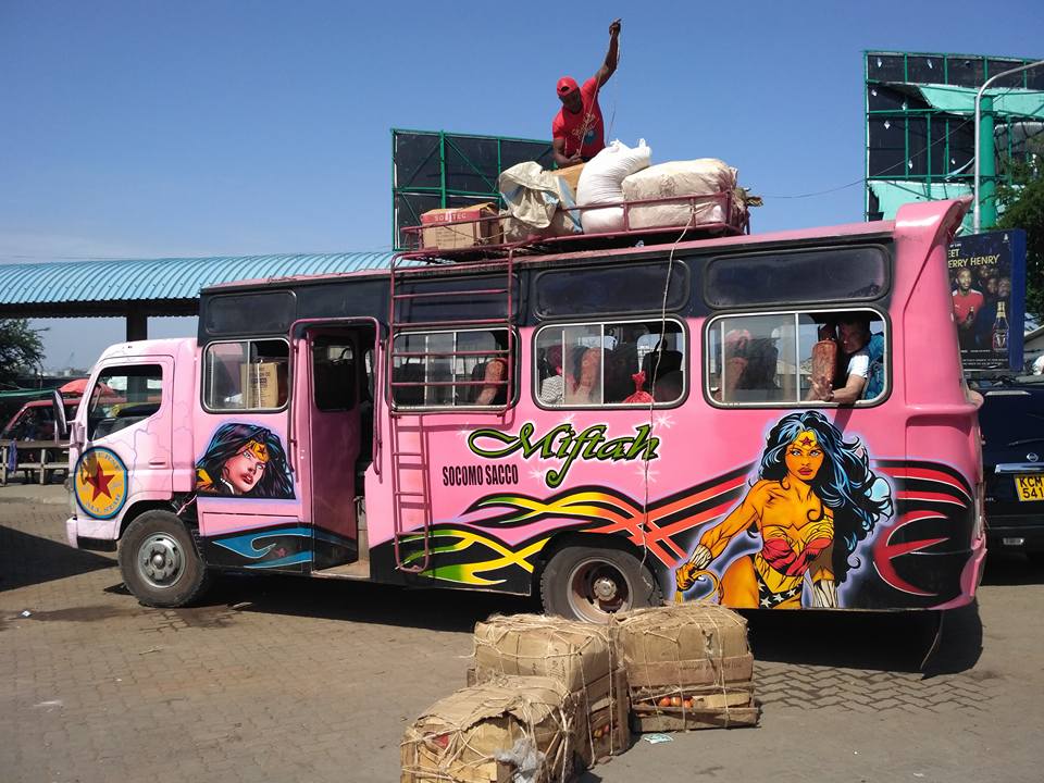 Zaraz koło przystani na drugim brzegu znajdowała się stacja matatu skąd odchodziły autobusy do Shimoni. Tam mieliśmy dojechać. Szybko znaleźliśmy właściwy autobus, różowy, z osobną kabiną kierowcy. Zaskoczyła nas niska cena przejazdu, 250 ksh, czyli 2,5 dolara od osoby. Autobus zapełnił wszystkie miejsca i ruszyliśmy. Za oknem płaski krajobraz. Momentami pola przypominały zupełnie polskie pejzaże. Jedynie palmy kokosowe i niekiedy bananowce nie pasowały do polskiego obrazka. Widzieliśmy plantacje trzciny cukrowej i fabrykę cukru.