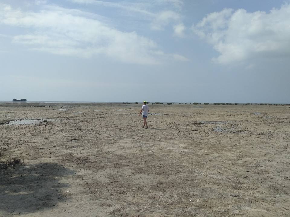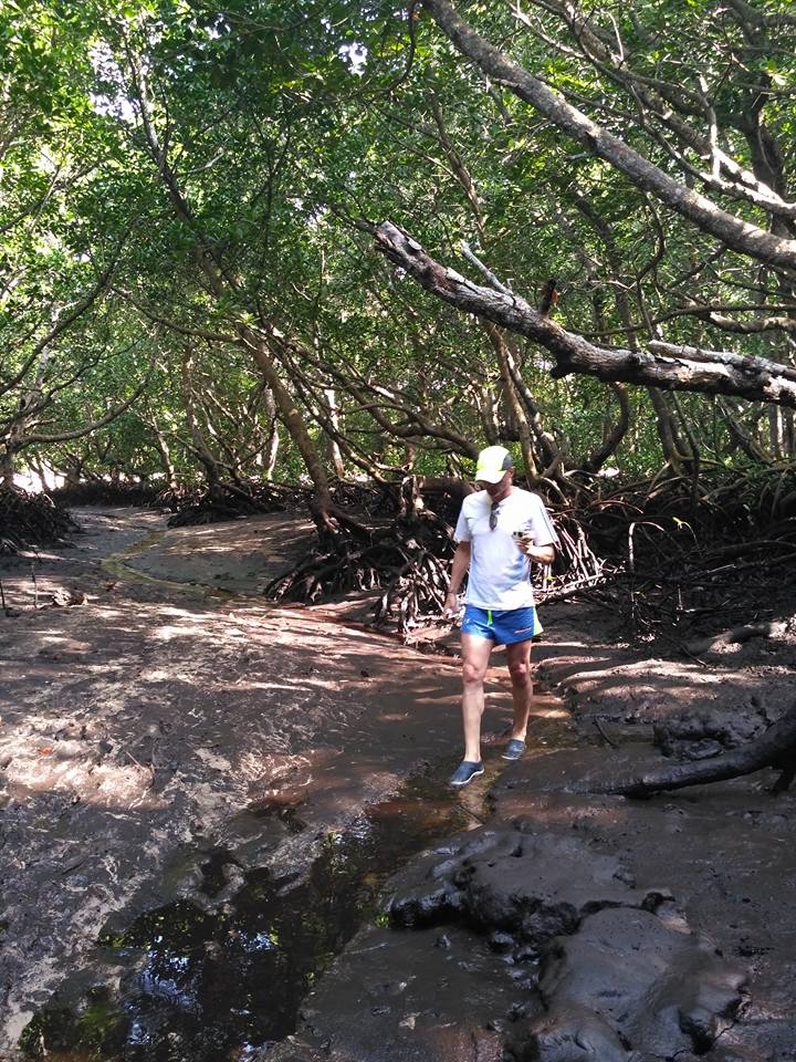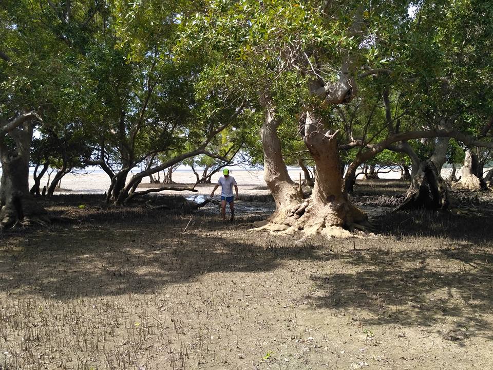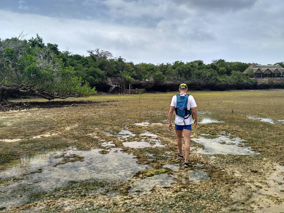 Chcieliśmy dziś przejść na drugą stronę wyspy i przez las mangrowy dotrzeć nad ocean. Nasza chatka znajduje się po stronie północnej, z widokiem na wodę i przeciwległy stały ląd. Planowaliśmy wrócić ze spaceru przed południem, aby posnurkować jeszcze zanim przypływ będzie zbyt duży. Wzięliśmy z naszej amfory chłodną butelkę wody i ruszyliśmy w kierunku wioski. Przy pierwszym dużym baobabie skręciliśmy na południe. Tę trasę już znaliśmy z poprzedniego dnia. Przeszliśmy przez małą wioskę rybacką i po kwadransie wyszliśmy na piaszczysty pas oddzielający ją od namorzyn. Znaleźliśmy ścieżkę, która wiodła przez las mangrowy. Spod naszych nóg uciekały tysiące małych krabików. Poszliśmy ścieżką w kierunku oceanu, ale niestety i dziś po przejściu około 100 metrów poziom wody był dość wysoki i zaczęliśmy grzęznąć w błocie. Zawróciliśmy. Za jakiś czas ukazała się kolejna ścieżka, podjęliśmy drugą próbę, ale i tym razem to samo, błoto i woda o średnim zapachu. Odpuściliśmy. Idąc dalej piaszczystym skrajem wyspy doszliśmy do zatoczki. Była akurat pora odpływu, woda cofnęła się o dobry kilometr. Na brzegu były wyrzucone przez wodę śmieci, butelki, plastikowe pojemniki, klapki i inne. Podobno to wszystko przypływa tu z Zanzibaru. Lokalne kobiety znając pory przypływów specjalnie się tu gromadzą i niczym na rynku robią „zakupy”.
