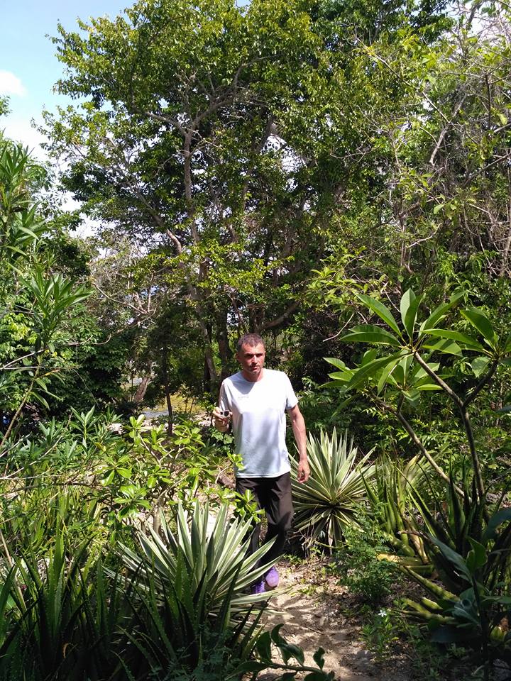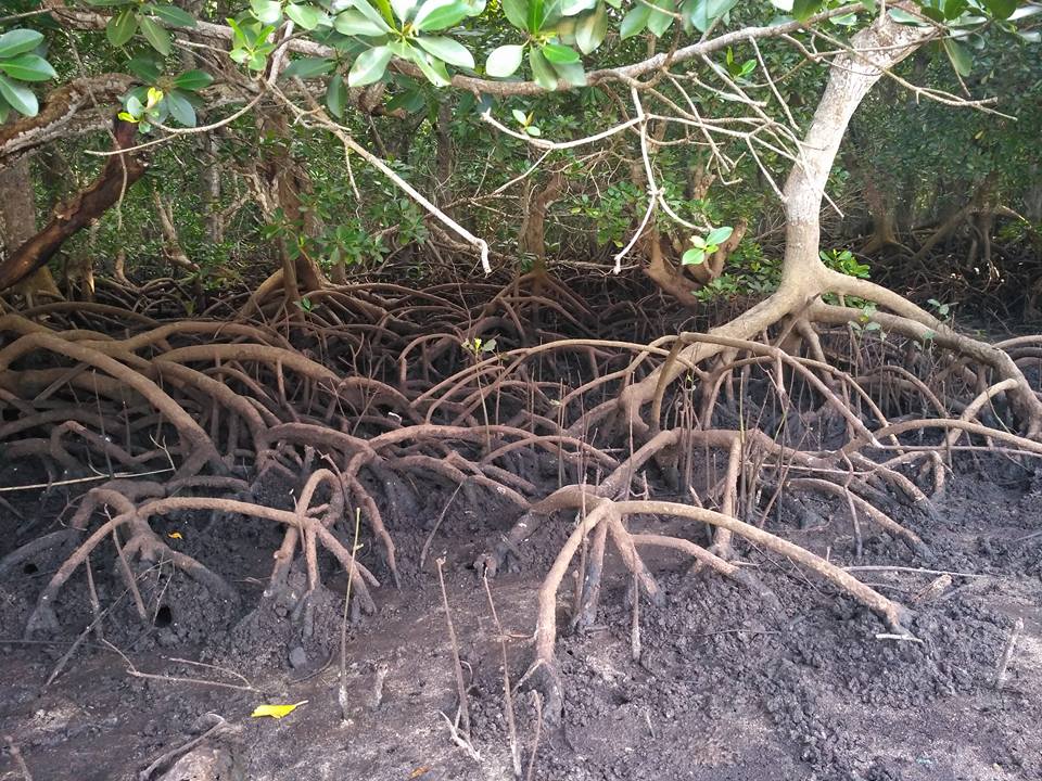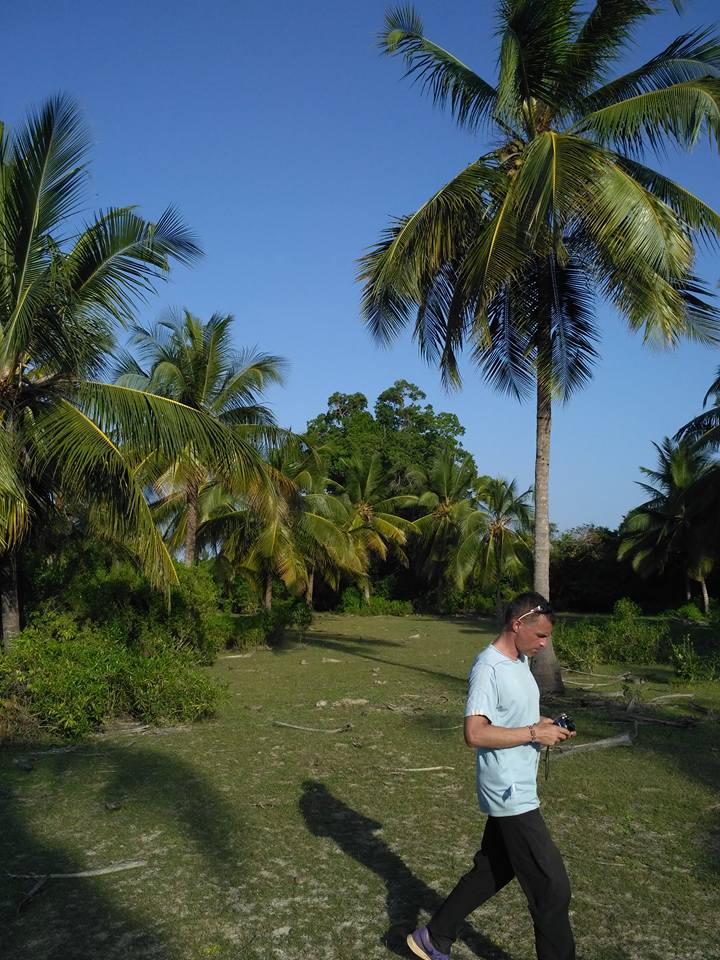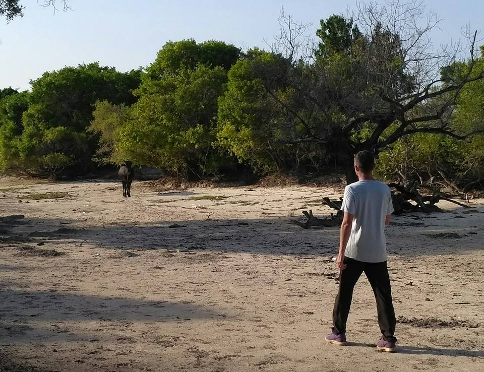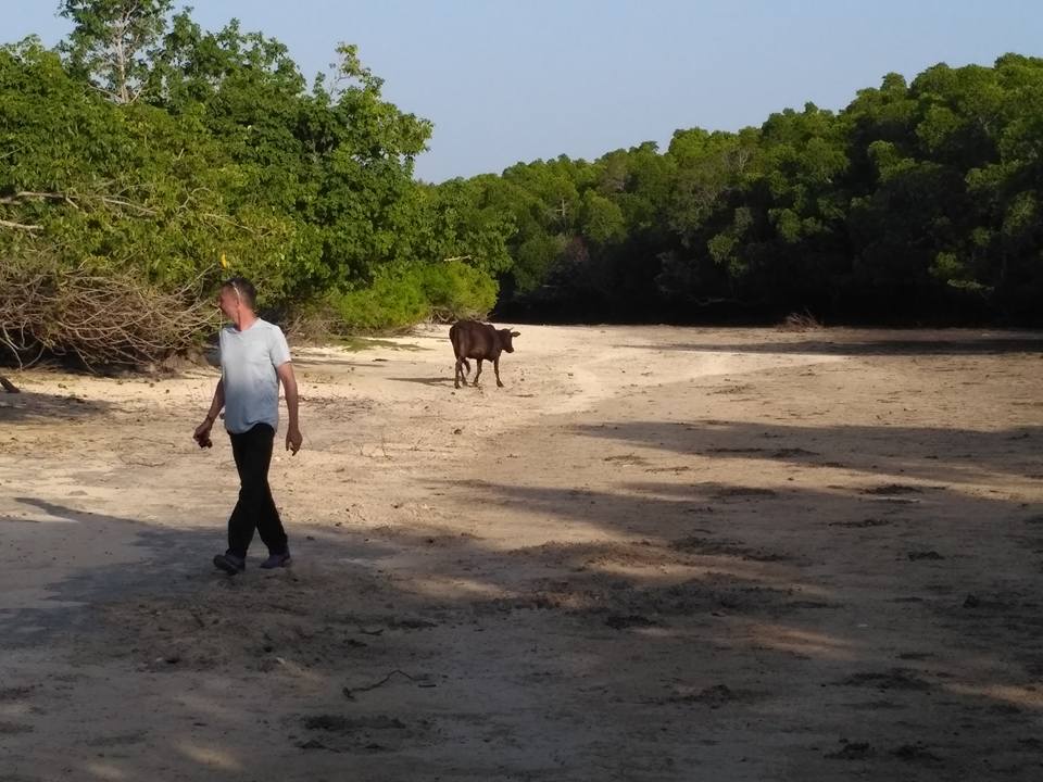 Chcieliśmy przedostać się na drugą stronę wyspy. Znaleźliśmy jakąś ścieżkę i szliśmy nią przez gęsty busz. W pewnym momencie krzaki się przerzedziły i weszliśmy na kokosową polanę. Z niej trafiliśmy na piaszczyste pole przypominające wyschnięte koryto rzeki, które stanowiło przedsionek przed lasem mangrowym. Las był bardzo gęsty, konary drzew na wierzchu. Znaleźliśmy ścieżkę prowadzącą nad otwarty ocean, ale niestety była już pora przypływu i ścieżka była zalana wodą i dość bagnista. Spotkaliśmy czarnego byka, tak jakby nas śledził. Wyszedł za nami z kokosowej polany. Yacool mierzył się z nim na siłę spojrzenia i wygrał. Byk odpuścił. Ja byłam gotowa, by wskoczyć na drzewo, gdyby byk zdecydował się na atak.