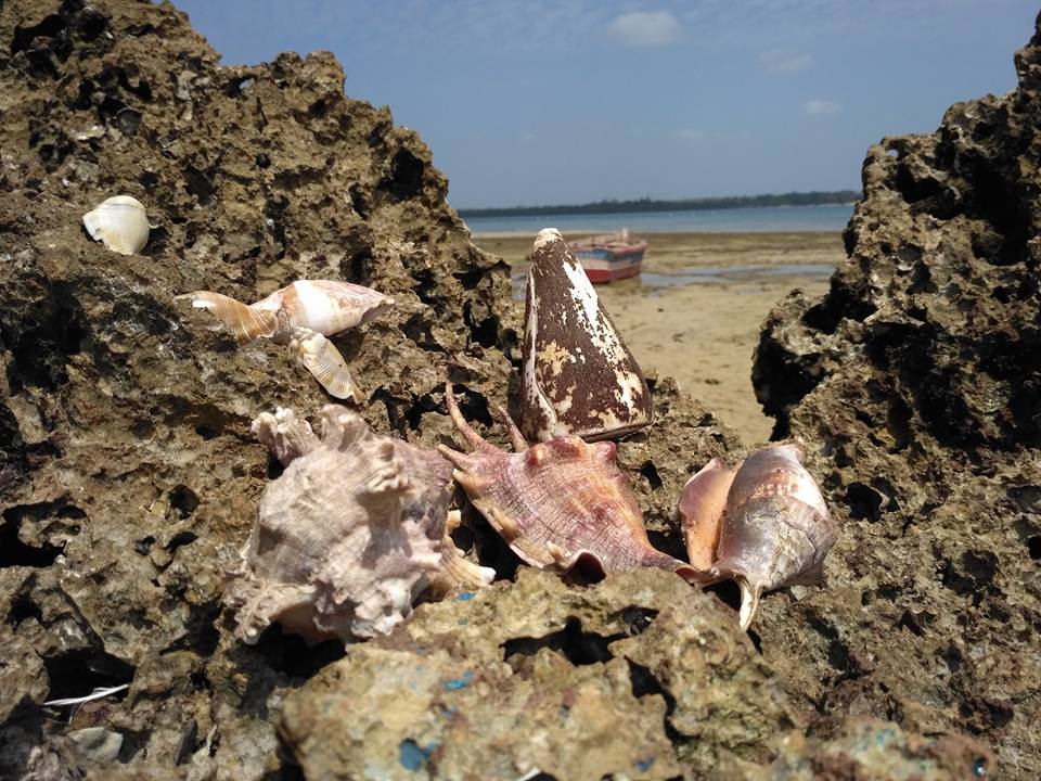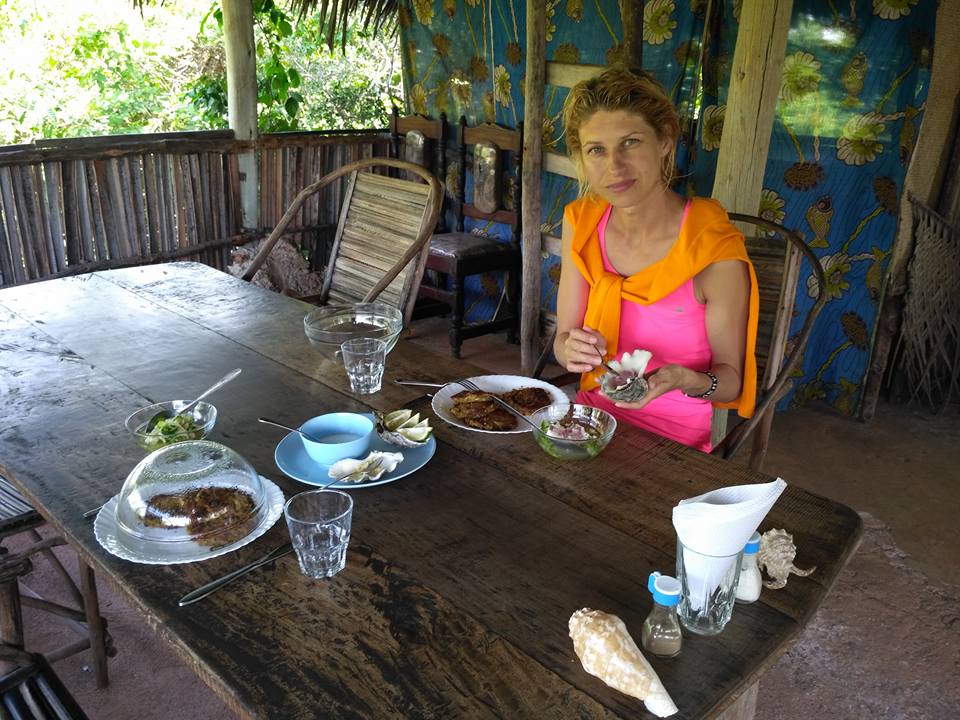 Po śniadaniu poszliśmy na spacer plażą w kierunku wioski. Okazało się, że to raptem parę minut od nas. Na odkrytej przez odpływ plaży dziewczynki łapały małe rybki. Powiedziały, że potem je zjedzą na surowo. Ale chyba coś źle zrozumiałam, bo Feisal twierdzi, że nie jedzą surowych ryb. Na plaży w czasie odpływu można znaleźć wiele rzeczy. Począwszy od pięknych szumiących muszli, na starych bateriach kończąc… Zaszliśmy do restauracji, która miała taras z widokiem na morze. Do niej przypływają ze snurkowych rejsów łodzie z turystami na lunch. Pracujący tam Kasim szybko się nami zajął, przyniósł nam świeże kawałki orzecha kokosowego. Yacool zamówił sobie piwo, ja sączyłam przez słomkę wodę z kokosa. Podobno świetnie nawadnia.